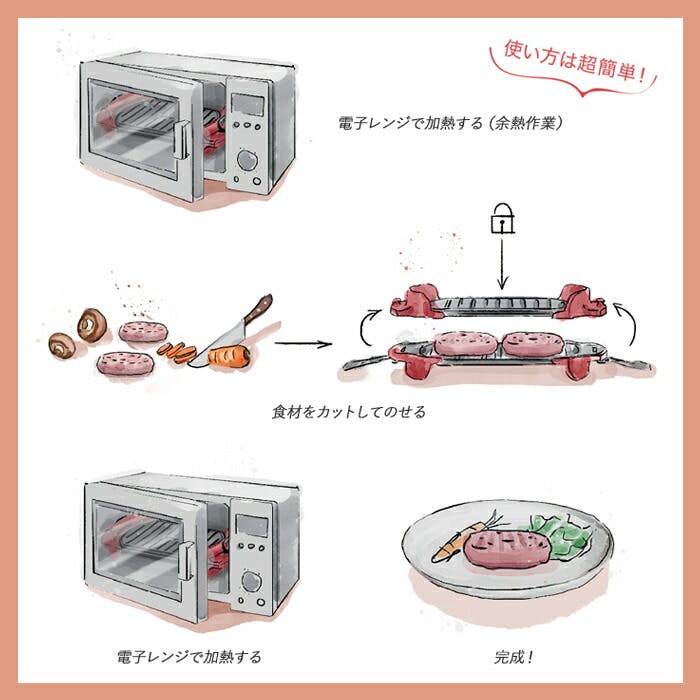 電子レンジでグリル料理が作れる「Microwave Grill」。 ホットサンド、野菜やお肉のグリル料理、グリルサーモンやローストビーフなど、様々な料理がこれ一つで作れます。 材料を挟んで電子レンジに入れるだけで出来るので、忙しい朝の強い味方に。