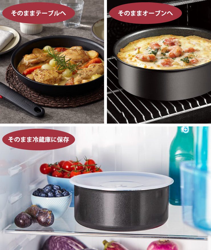 取っ手がとれるから重ねて収納ができて、キッチンがいつでもすっきり。熱々のままテーブルに出せるし、オーブンや冷蔵庫にそのまま入れることもできる。料理するときも保存するときも、洗うときも。ずっとノーストレスだから、料理が楽しくなります。 幅広い層に人気のスタイリッシュなブラックカラー。ハンドルがプラス1本とレシピ本がついた特別セットです。