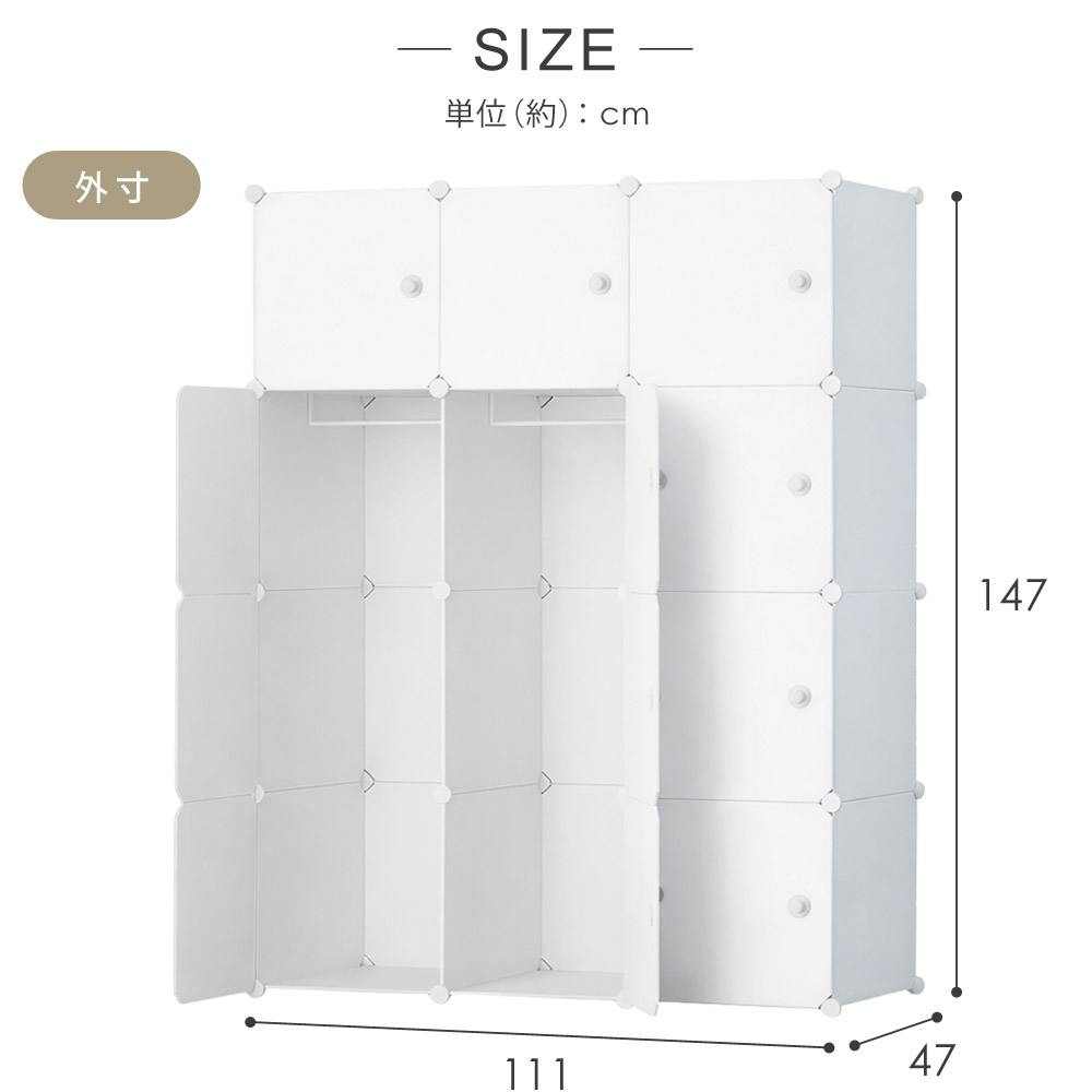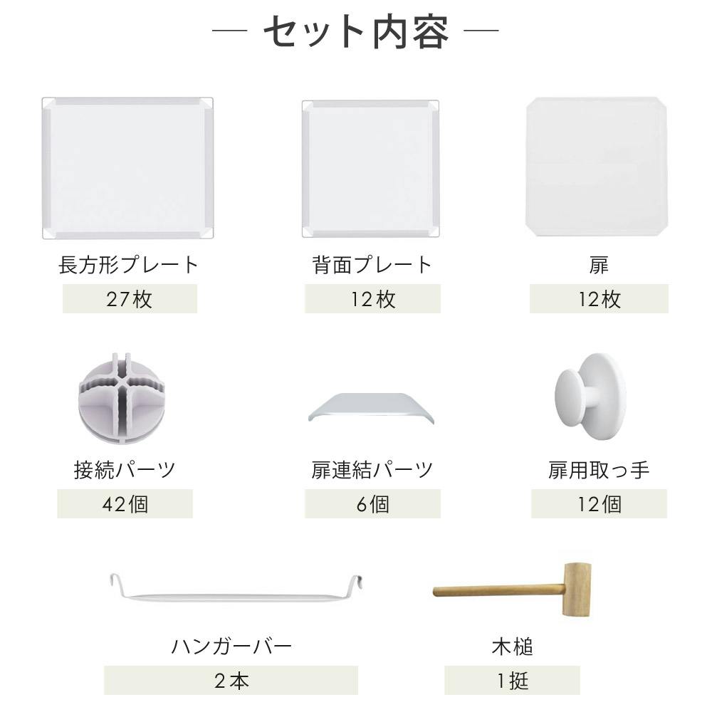 ■本体サイズ(約) 横幅111×奥行47×高さ147cm■製品重量(約) 11.3kg■耐荷重量(約) 1ボックスあたり5kg■材質 PP樹脂、ABC、鉄■セット内容 長方形プレート×27、扉×12、背面プレート×12、接続パーツ×42、扉連結パーツ×6、扉用取っ手×12、ハンガーバー×2