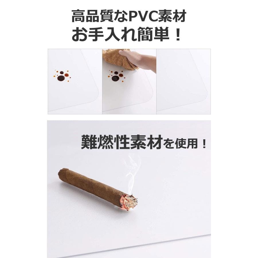耐摩耗性、耐久性に優れた素材。透明度が高く、洗浄が容易。角が丸くて安心。高品質なPVC素材、お手入れ簡単!難燃性素材を使用!