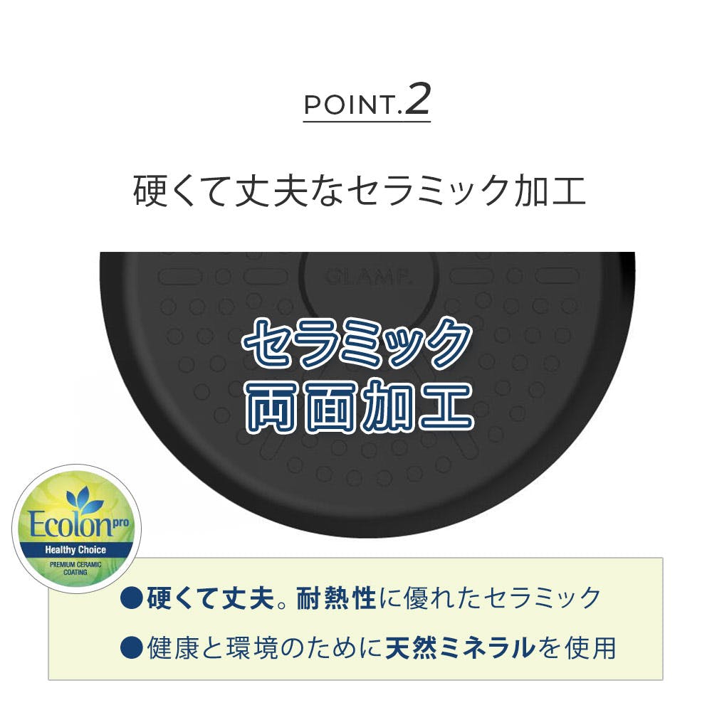 PFAS(有機フッ素化合物)を使用しいない人体と環境に優しいセラミックコーティングのフライパン。PFOA、鉛、カドミウム、アンチモンなどの有害物質を不使用なので、安心してお使いいただけます。 天然ミネラルを使用したセラミックコーティングのフライパン。独自開発のコーティング技術「エコロンプロ」を駆使し、セラミックコーティングの弱点であるノンスティック効果を大幅にUP。 5層に及ぶコーティングにより耐久性もUP。保温性の高いアルミ基板を中心にセラミックコーティングを両面に施すことで、熱伝導がよくな