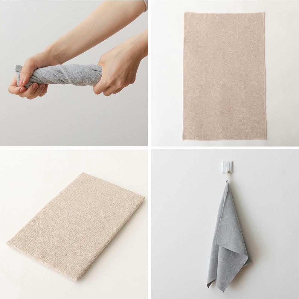 水跡が残りにくく、二度拭きいらず、油汚れまで洗剤なしで拭き取れるふきん。 髪の毛の約1/100の細さのマイクロファイバーの極細繊維が、目に見えない凹凸に入り込み、ミクロン単位の汚れやホコリも余すことなく拭き取ります。