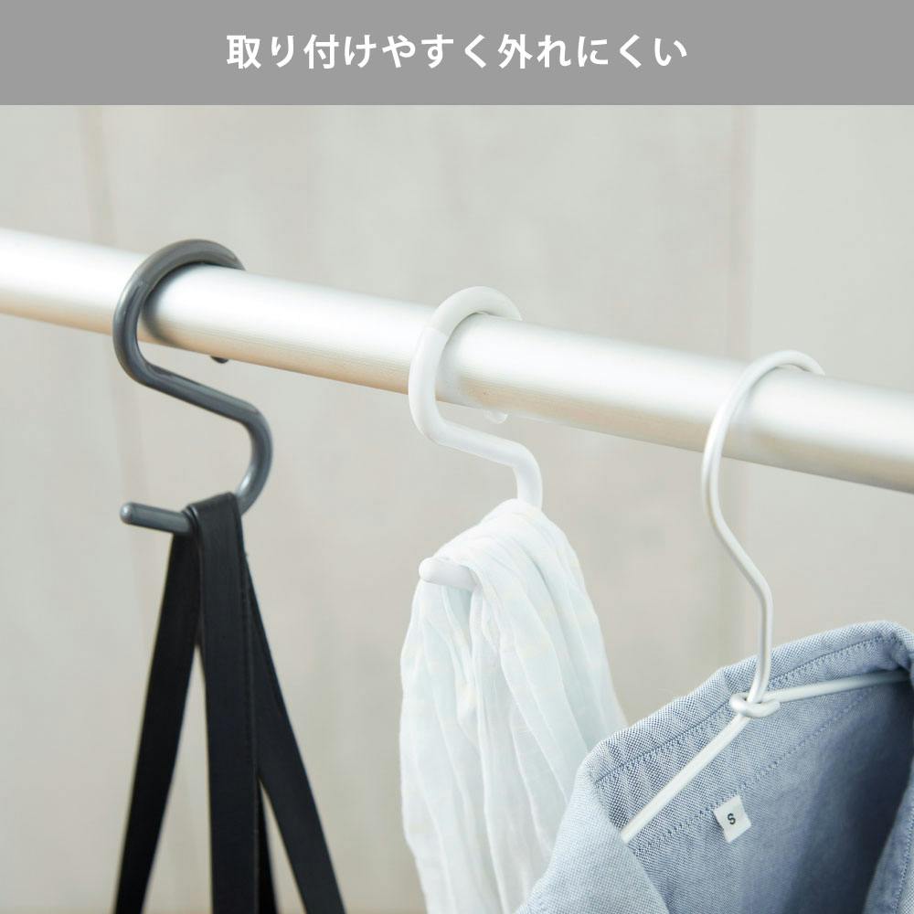 先端がフレキシブルに曲がり、モノを掛けたり取ったりする時もバーからはずれにくいS字フックです。 バスルームの掃除道具や、小物の収納に活躍します。