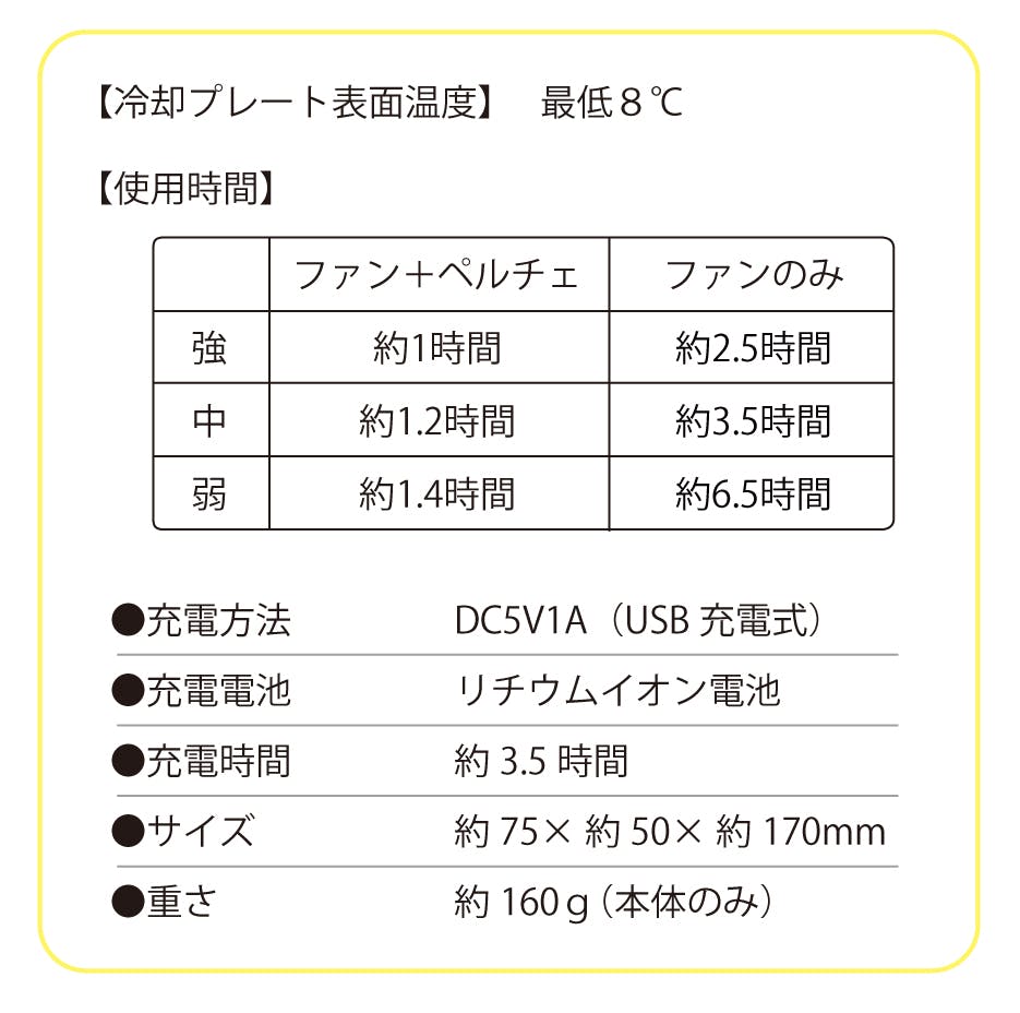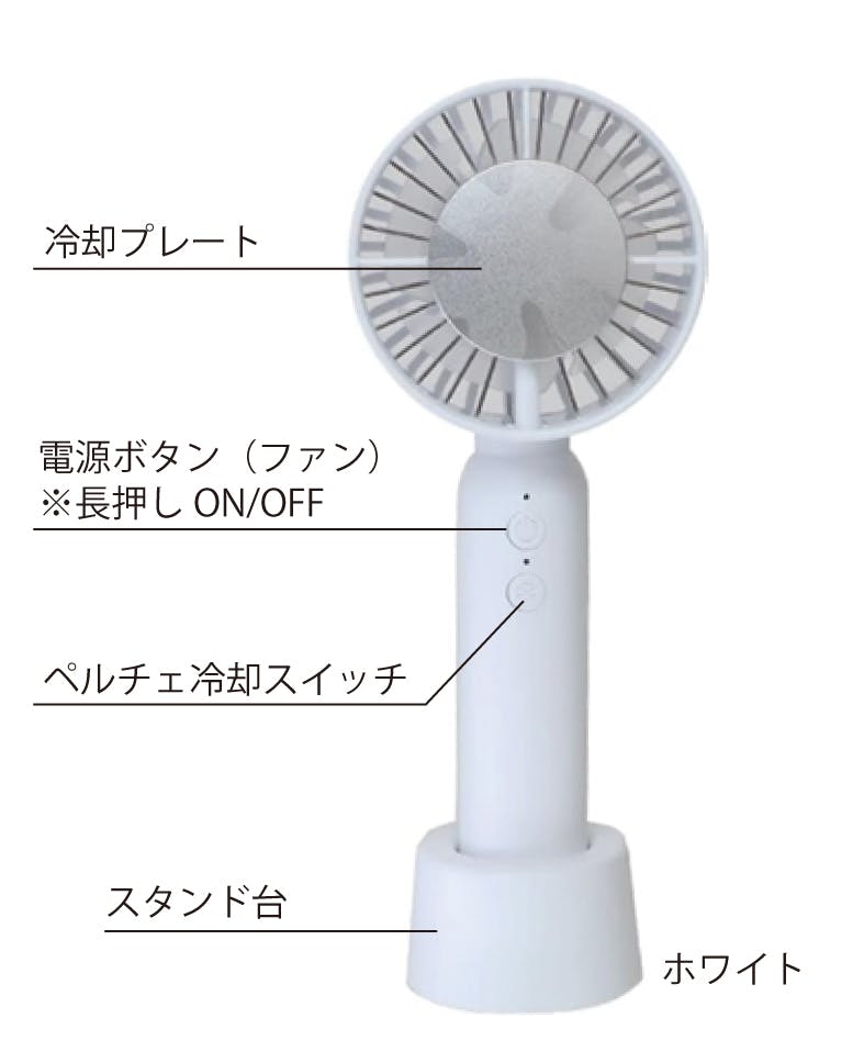 ・ペルチェハンディファン本体×1・スタンド台×1・充電用USB ケーブル×1・取扱説明書兼保証書×1※充電式バッテリー内臓