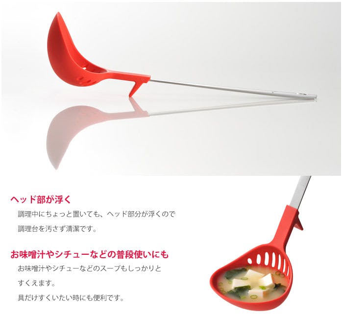 傾けるだけで「サッ」と水切り。お玉、穴あきお玉、みそときがこれ一本。包み込むような形状でお味噌が逃げにくく、ほどよくお湯が入るので、味噌溶きが簡単です。お味噌汁をすくう、具だけをすくい分けるときもラクラク。 ブロッコリーやウィンナーなど、ちょっとしたゆでものに。ザルを出さなくてもその場でサッとすくって水切りできます。