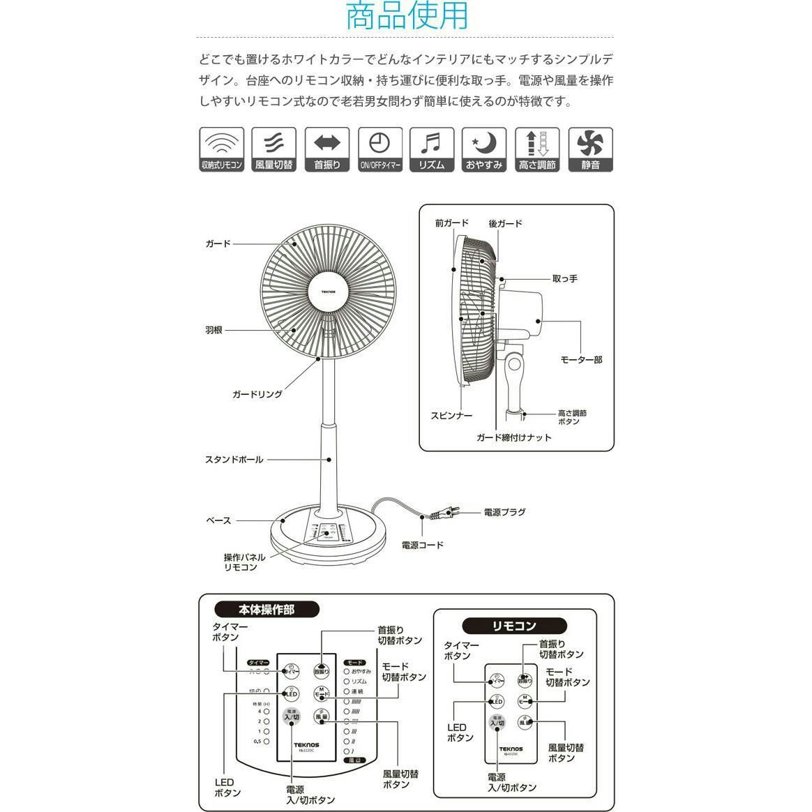■消費電力 2~20W(50Hz/60Hz)■本体寸法(約) 幅360×奥行350×高さ680~870mm■羽根径 30cm■本体重量 2.8kg■その他機能 フラットガード■風量6段階切替■首振り■7.5時間入/切タイマー■リズム・おやすみモード搭載