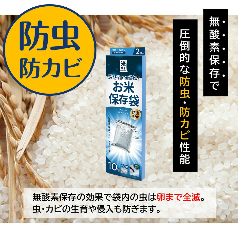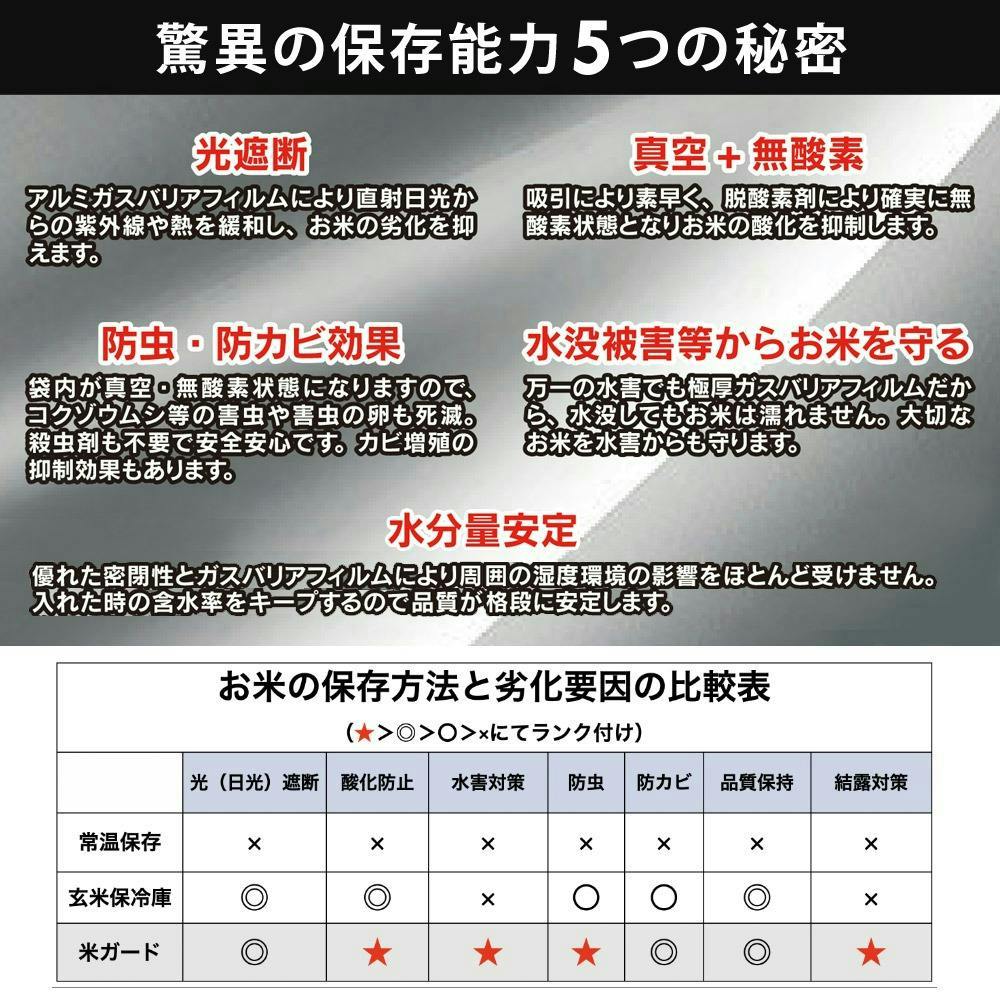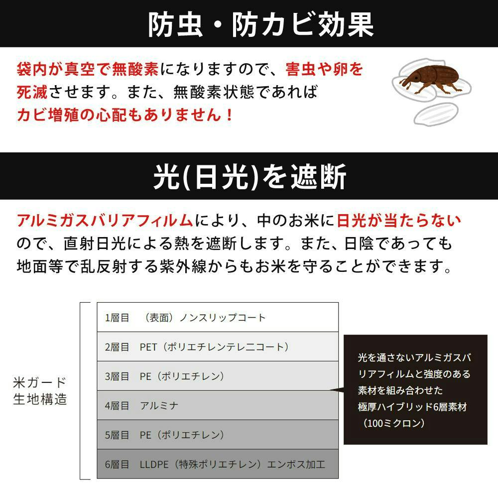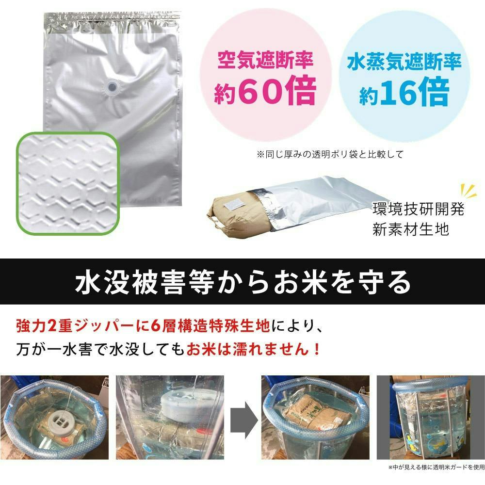 ■防虫・防カビ効果/袋内が真空・無酸素状態になりますので、コゾウムシ等の害虫や害虫の卵も死滅。殺虫剤も不要で安心安全です。カビ増殖の抑制効果もあります。■水没被害等からお米を守る/万一の水害でも極厚ガスバリアフィルムだから、水没してもお米は濡れません。大切なお米を水害からも守ります。