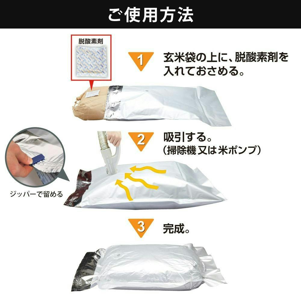 ■光遮断/アルミガスバリアフィルムにより直射日光からの紫外線や熱を緩和し、お米の劣化を抑えます。■真空・無酸素/吸引により素早く、脱酸素剤により確実に無酸素状態となりお米の酸化を抑制します。