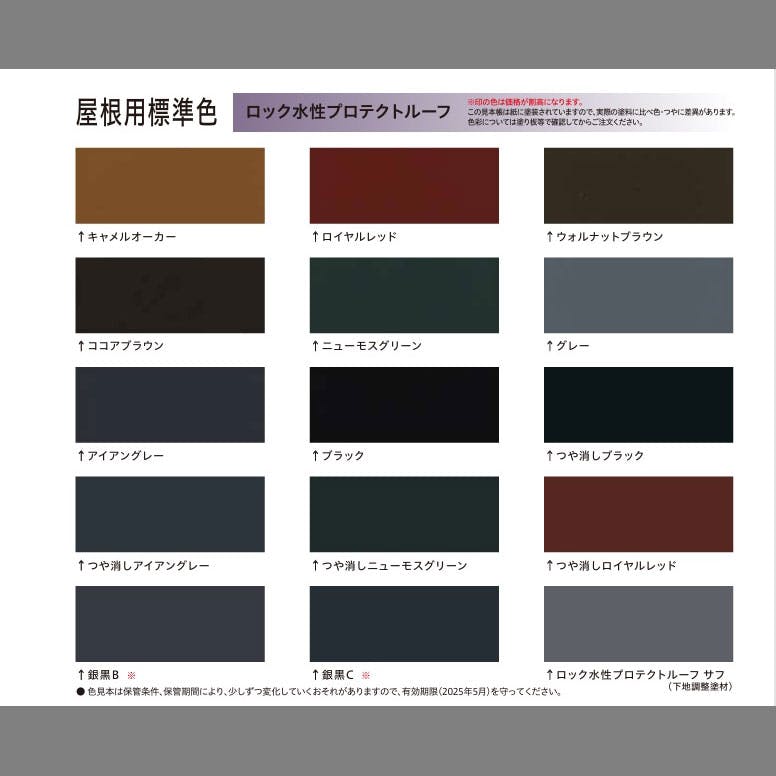 カラーベスト屋根の金属製棟包み板は、錆が発生していなければ研磨タワシなどで表面を荒し、上塗塗料を直接塗装してください。乾式洋瓦(モニエル、スカンジア瓦など)へは、塗装出来ません。粘度が低いため、壁面への塗装は向きません(タレる)。湿度の高い時や7℃以下の場合は塗装できません。