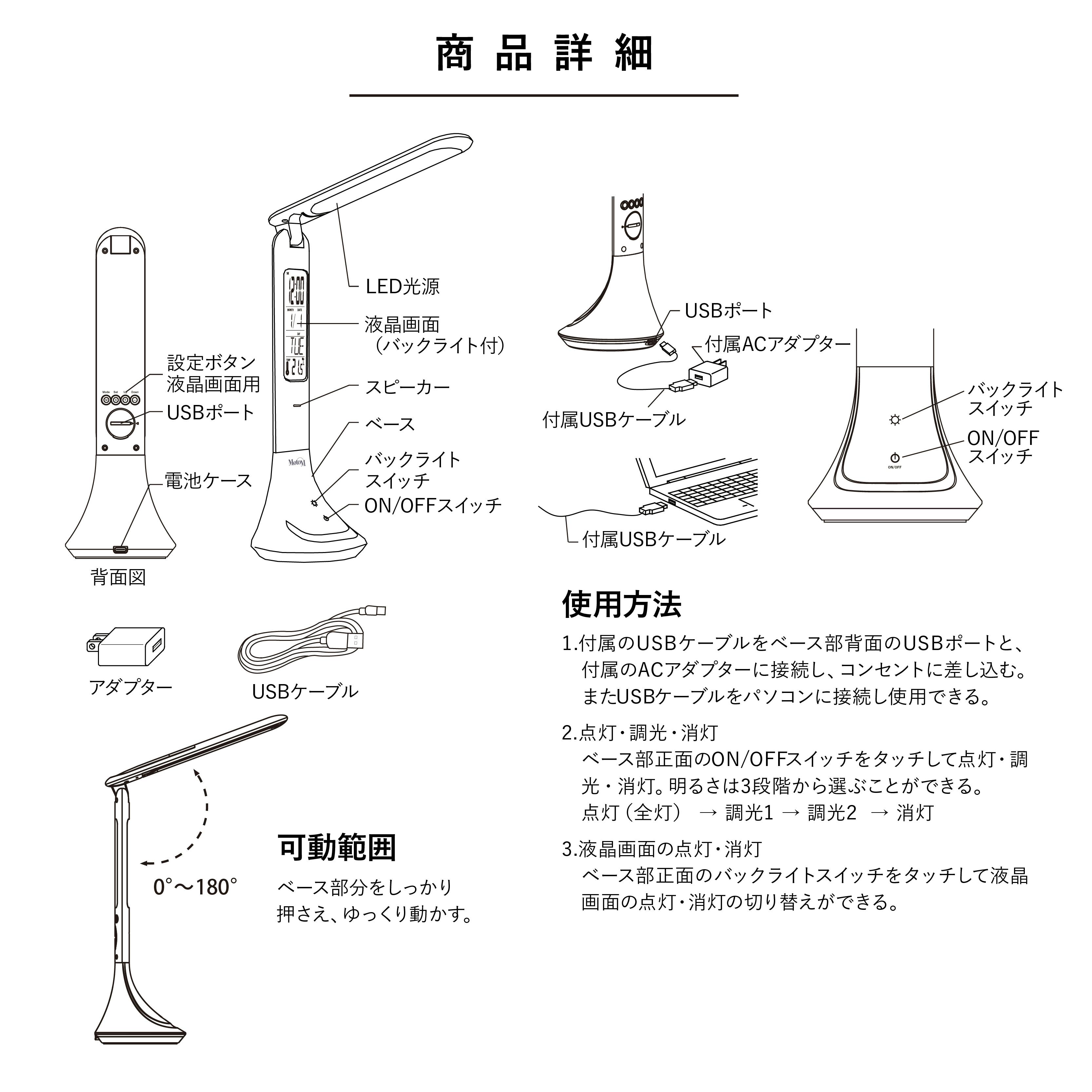 USBケーブル1m付き、ACアダプター付属商品。※製品の色調はお客様のご使用のモニターやブラウザなどの環境により、実物と異なる場合がございます。