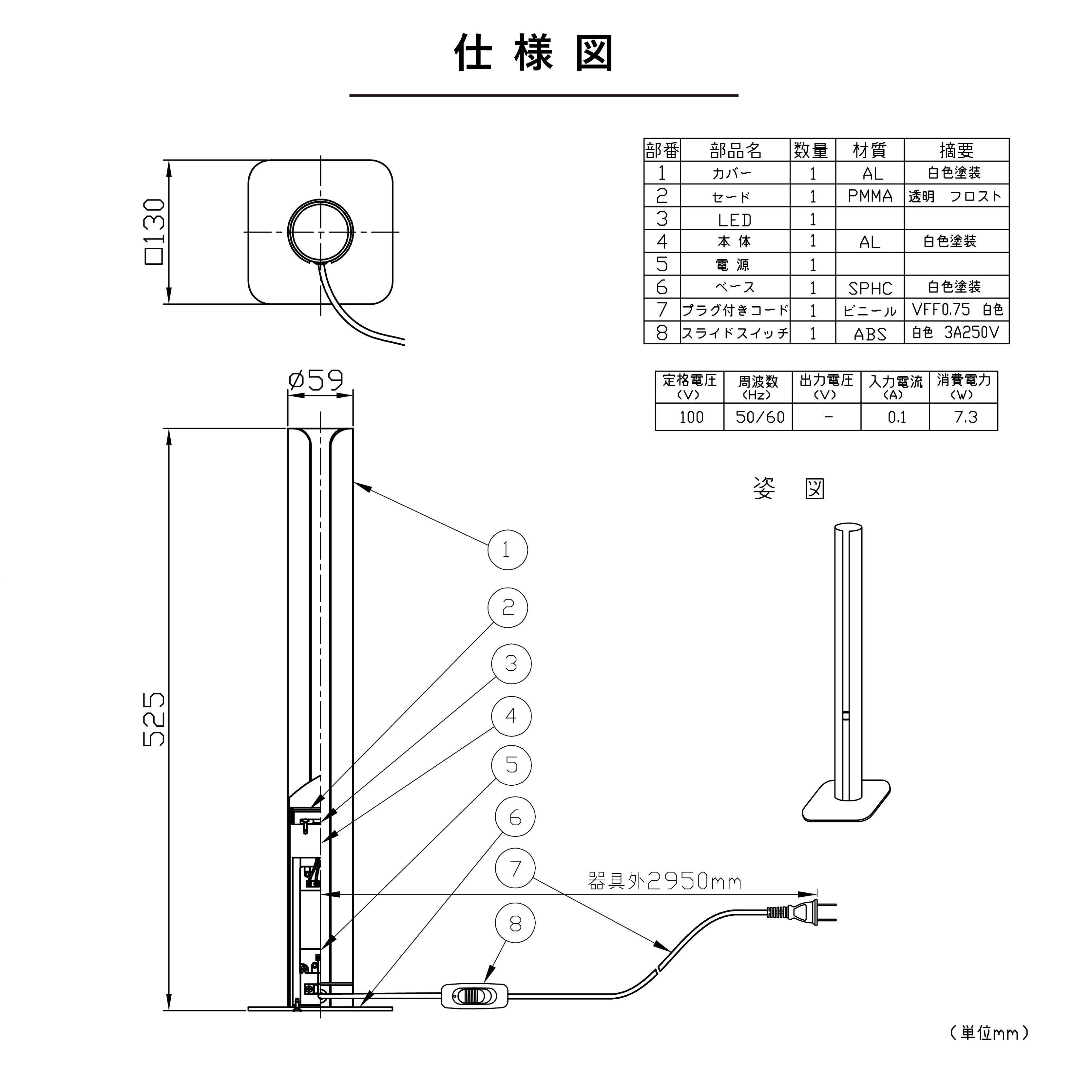 取り付け:コンセントプラグ、コード:2.95m付き、中間スイッチ付。