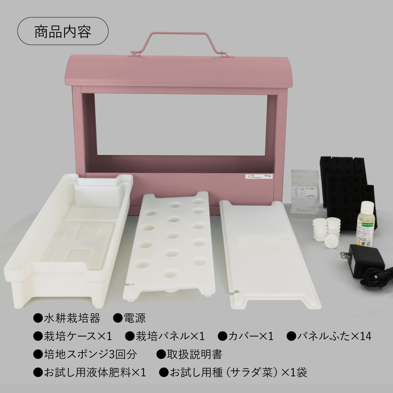 栽培ケース×1個、栽培パネル×1個、カバー×1個、パネルふた×14個、お試し用液体肥料1個、お試し用種子(サラダ菜)、栽培スポンジ48個(3回分)、ACアダプター×1個、取扱説明書、保証書