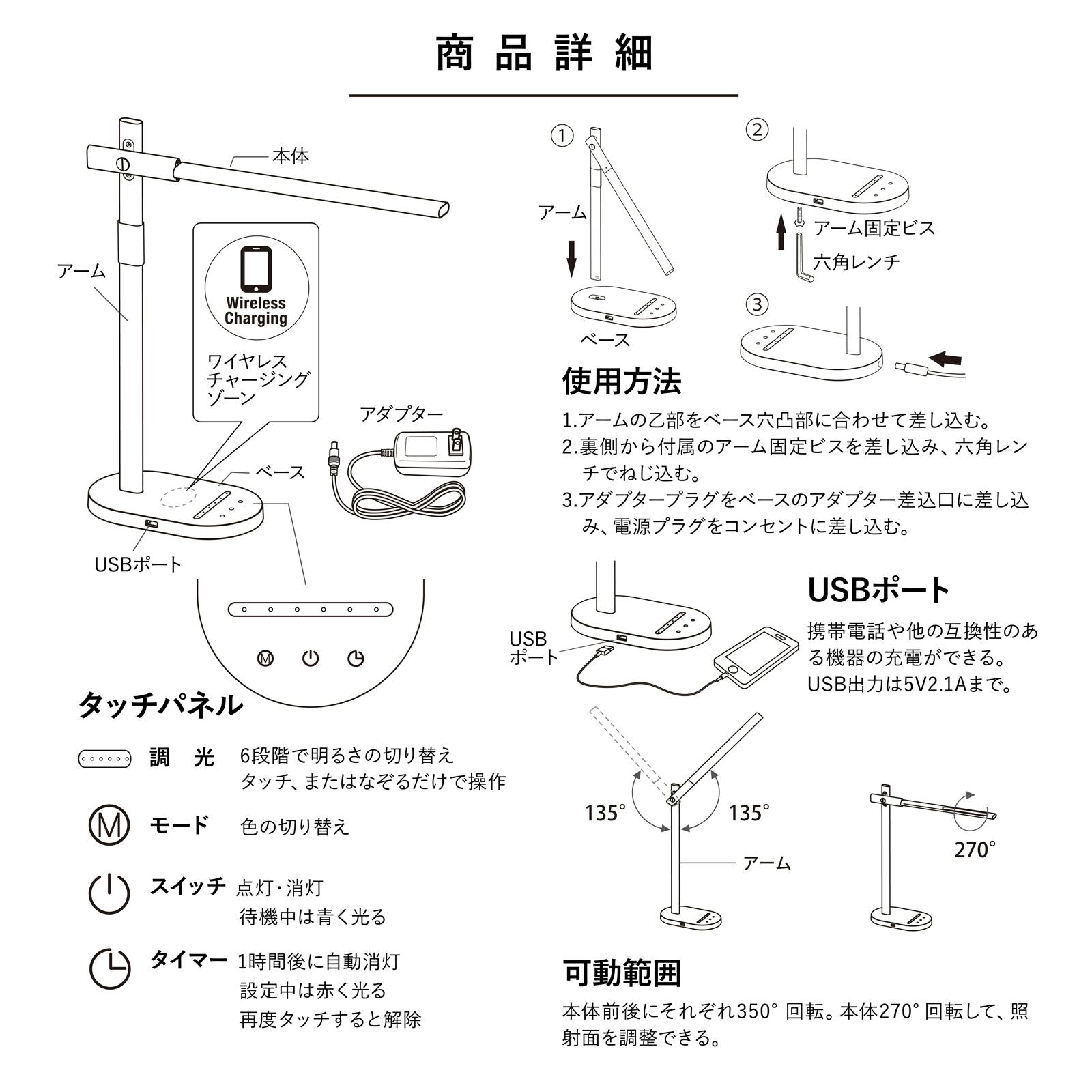 光源寿命:35,000時間、取付:ACアダプター、コード1.5m付き、USBポート1口/5V 1A。1時間オフタイマー(1時間後に自動で消灯します。六角レンチ付で組み立て式で簡単に組み立てられます。USBポートをつないでデジカメなど電子機器を充電できます。