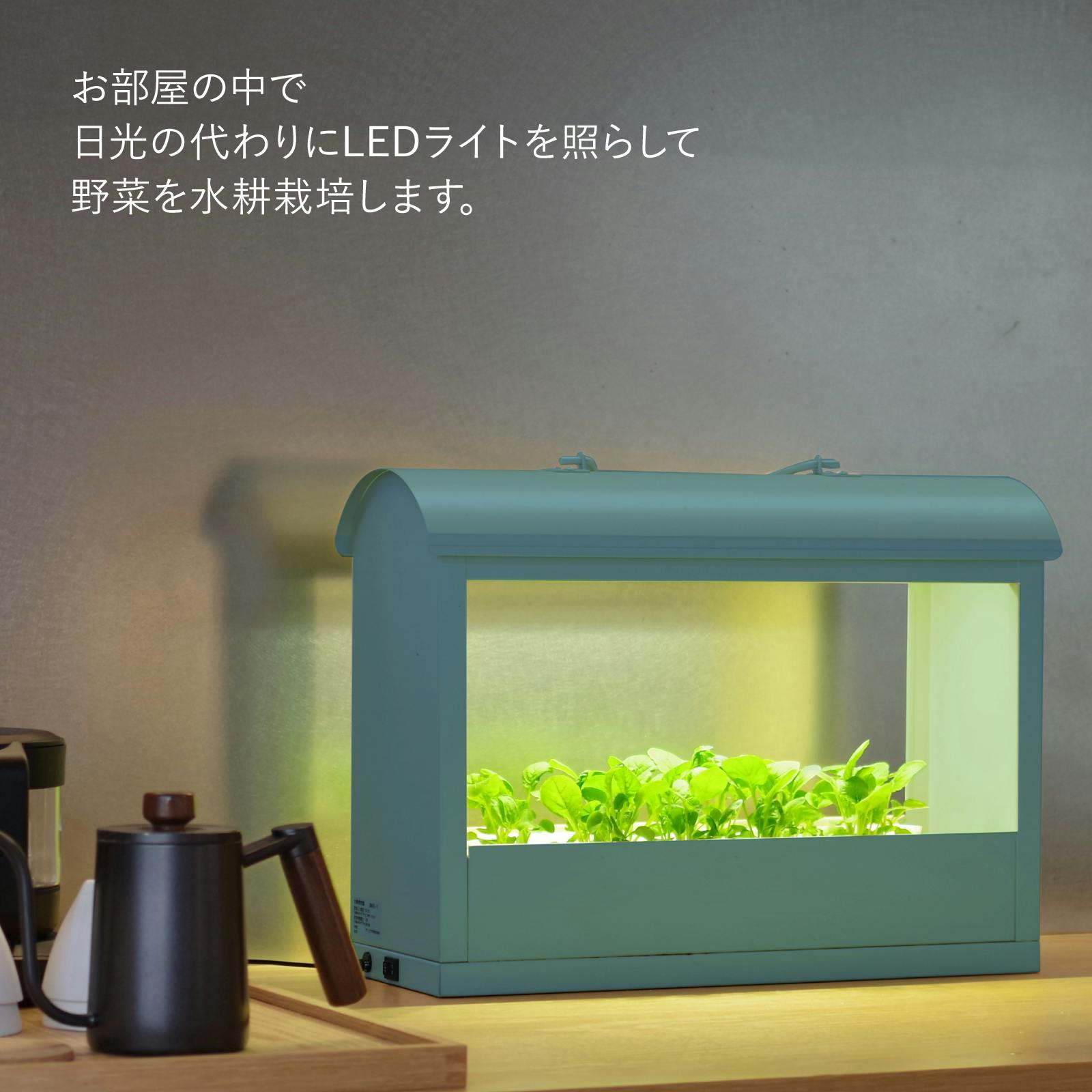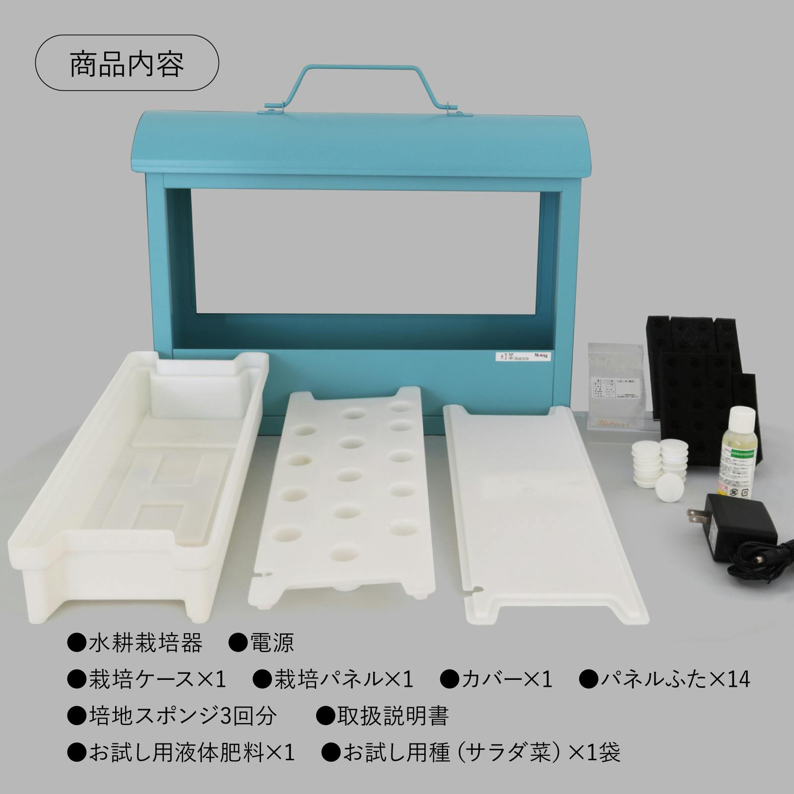 栽培ケース×1個、栽培パネル×1個、カバー×1個、パネルふた×14個、お試し用液体肥料1個、お試し用種子(サラダ菜)、栽培スポンジ48個(3回分)、ACアダプター×1個、取扱説明書、保証書