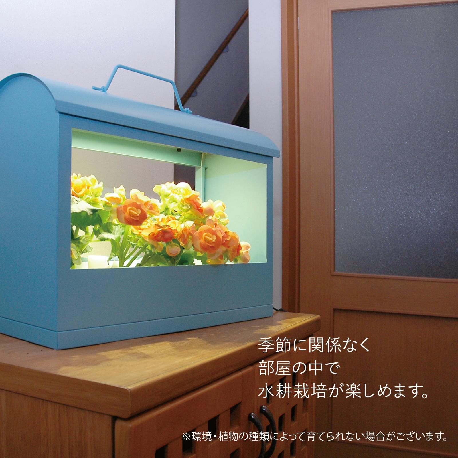 カラフルな栽培器。光が強いため、レジナトマトなど栽培できる。栽培終了後、栽培ケースは中性洗剤で洗うことができます。