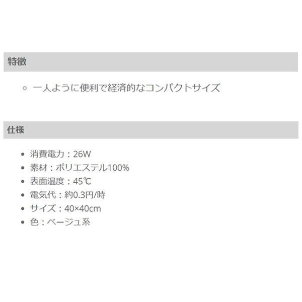 ■消費電力 26W■素材 ポリエステル100%■表面温度 45℃■電気代 約0.3円/時■サイズ 40×40cm■色 ベージュ系