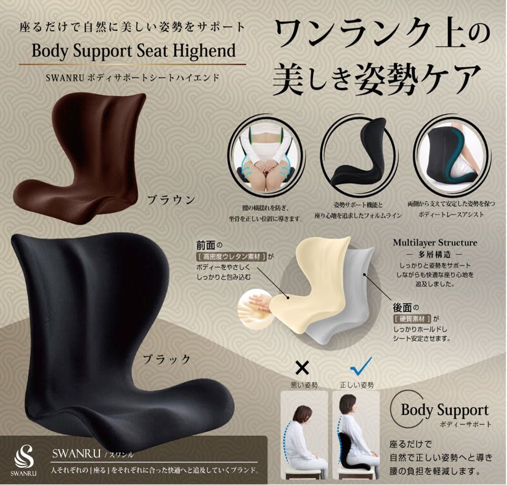 ●腰の揺れを防ぎ、坐骨を正しい位置に導きます。 ●座るだけで自然で正しい姿勢へと導き、腰の負担を軽減します。 ●姿勢サポート機能と座り心地を追求したフォルムライン。 ●両側から支えて安定した姿勢を保つボディトレースアシスト。 ●全面の【高密度ウレタン素材】がボディをやさしくしっかりと包み込む。 ●後面の【硬質素材】がしっかりホールドし、シートを安定させます。