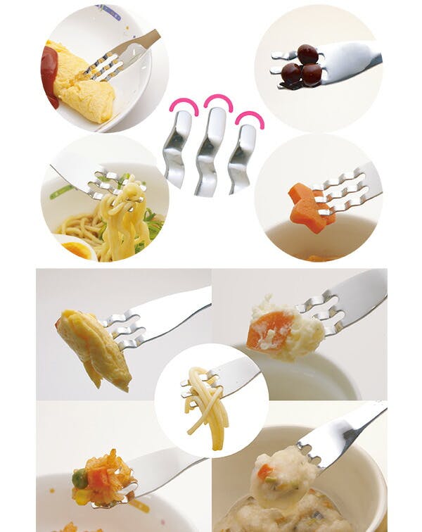 上手に食べられる!を科学したフォーク。 ラーメン、そうめん、そば、春雨…、ナミナミが引っ掛けるだけで程よく絡みます。幅広のナミナミで転がる豆なども上手にすくえます。