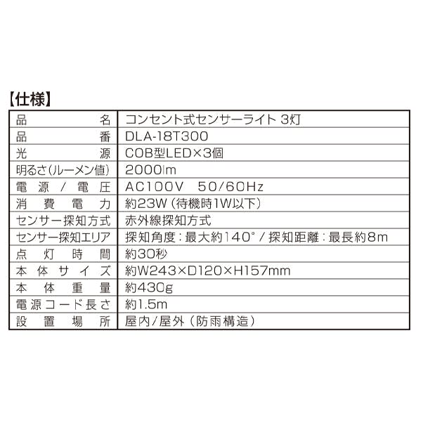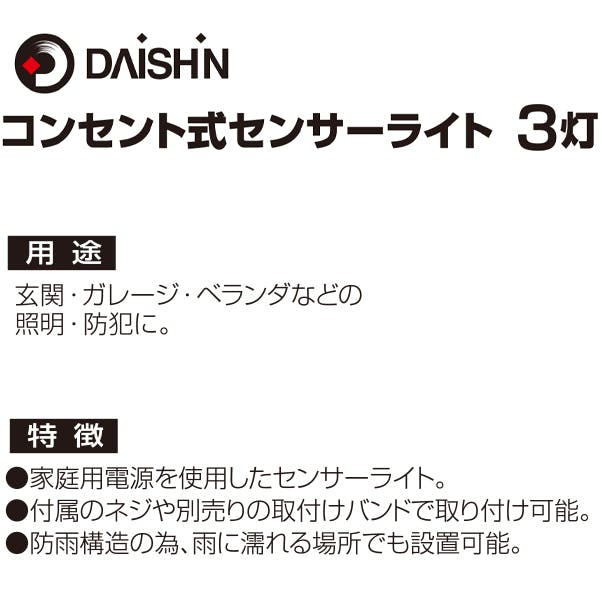 大進 人感 センサーライト AC100V コンセント式 屋外用 3灯式 LED 防雨 暗くなると点灯 防犯ライト DLA-18T300