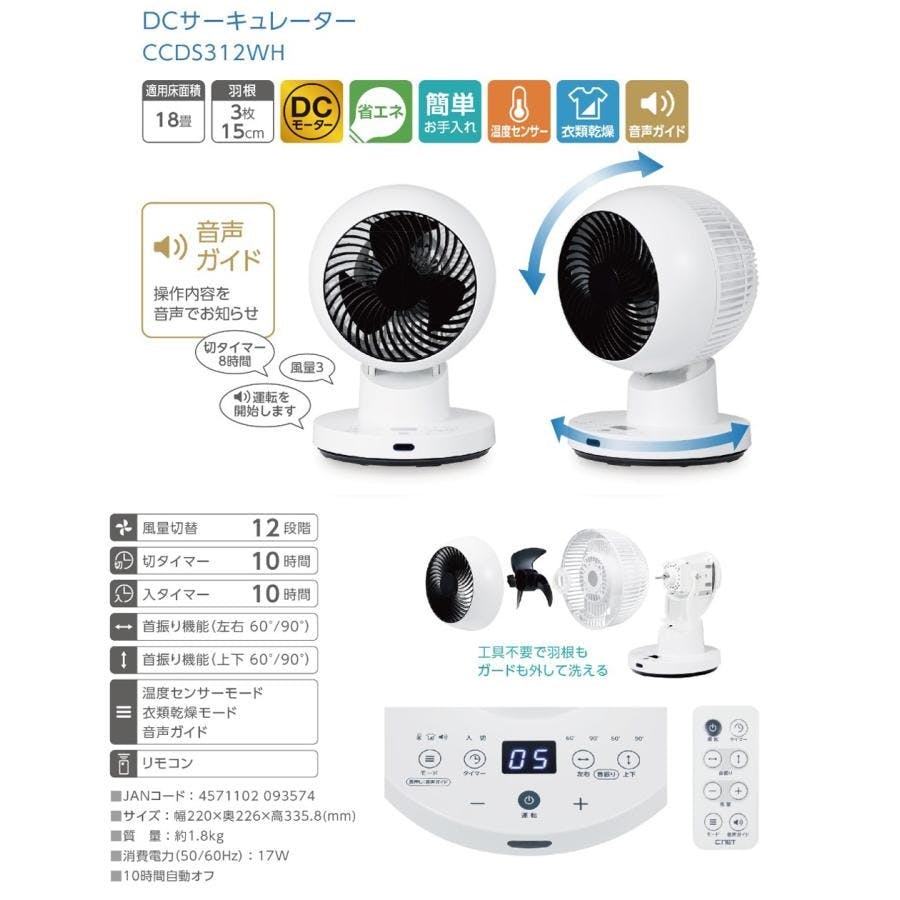 サーキュレーター DCモーター 15cm 3枚羽根 18畳 上下左右自動首振り 3D首振り リモコン式 CNET シィー・ネット CCDS312WH