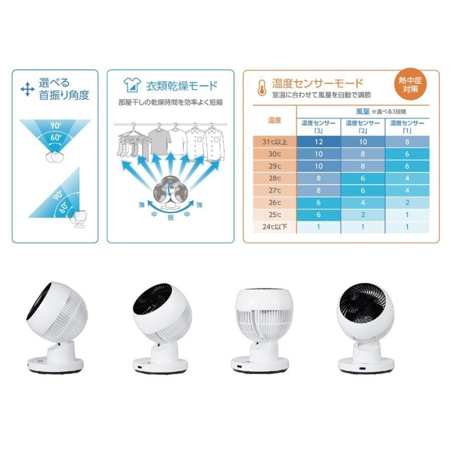 ■自動首振り:左右(60度/90度)、上下(60度/90度)■消費電力:17W■電気代の目安:約0.5円■コード長:約1.5m