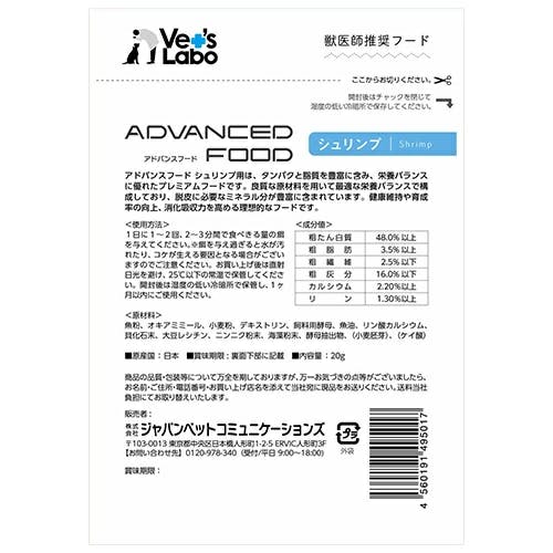 アドバンスフード シュリンプ 20g〈国産〉ベッツラボ 熱帯魚 アクアリウム用 エサ 獣医師の視点から魚の成長に必要な栄養を満たす事で魚本来の健康で美しい身体づくりを目指すフード
