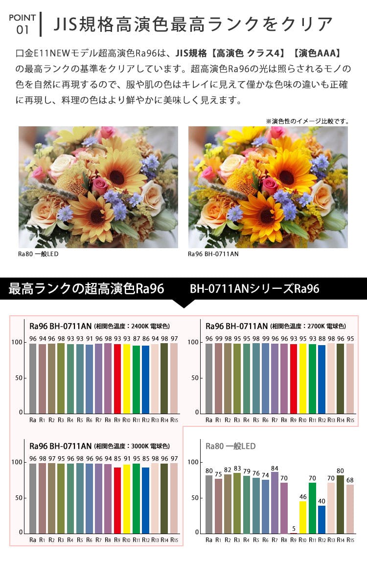 • 高演色クラス4 演色AAA LED電球 E11 60形相当 高演色Ra96 フリッカーフリー 電球色3000K BH-0711AN-WH-30-Ra96