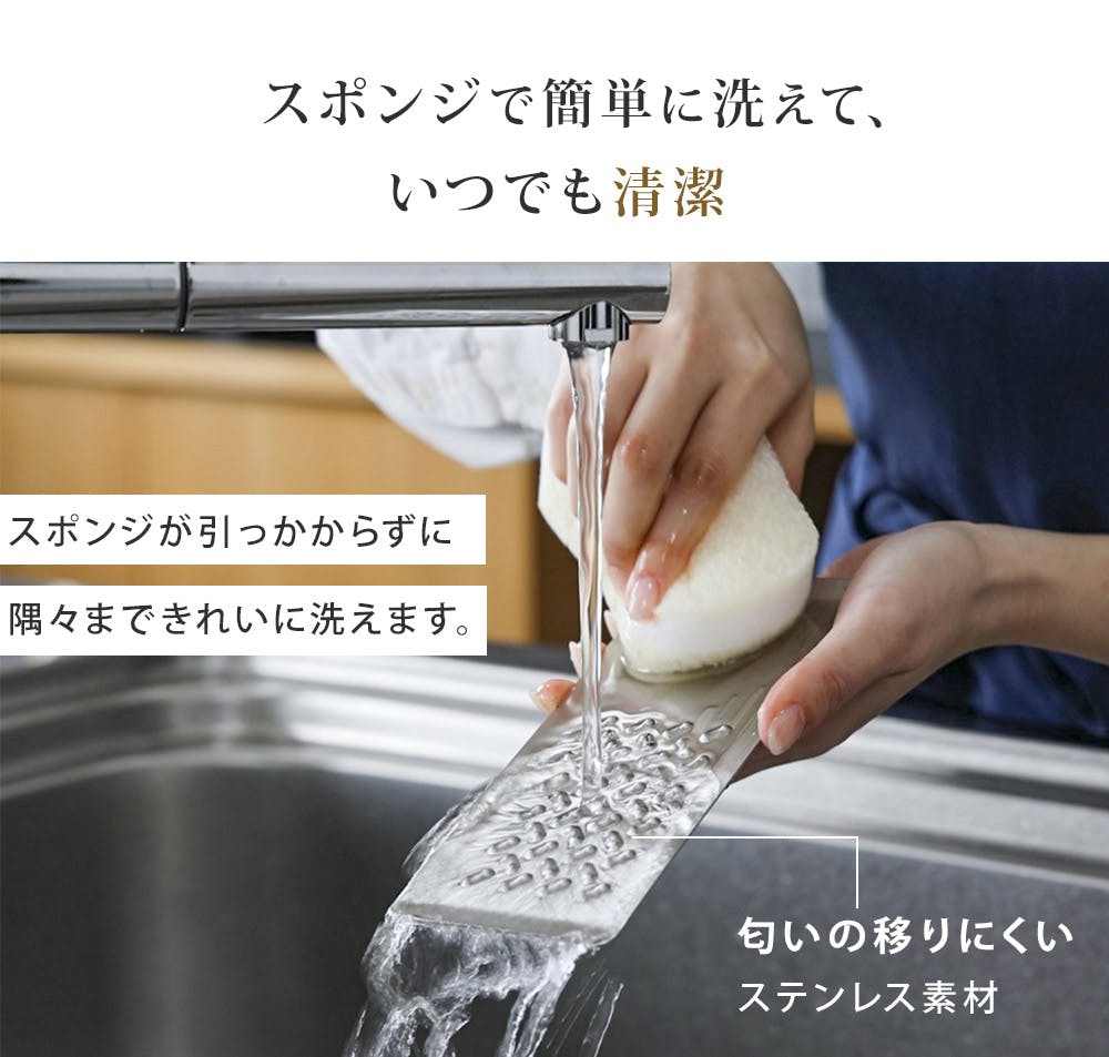 従来のおろし金は、鋭い刃があって、食材を最後まですりおろすことが難しいものもありました。 その点「トミタ式おろし金」は、手を触れても痛くない突起を採用しているため、ニンニクのような小さな食材も無駄なく、安全に最後まですりおろすことができます。