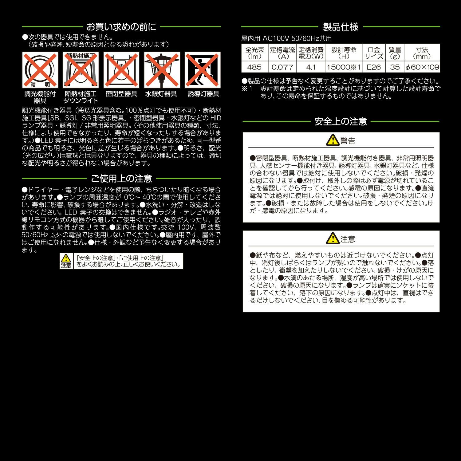 ●水滴のかかる状態や湿度の高い所、結露が起こる場所では使用しないで下さい。●電球とは光の広がり方が異なりますので、器具の種類によっては、適切な配光や明るさが得られない場合があります。●ランプの分解や改造は行わないで下さい。●部品の交換を行うことはできません。