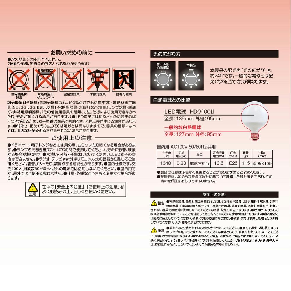 • スタイルド(STYLED) LED電球 E26 ボール電球形 100W形相当 電球色 広配光 HDG100L1