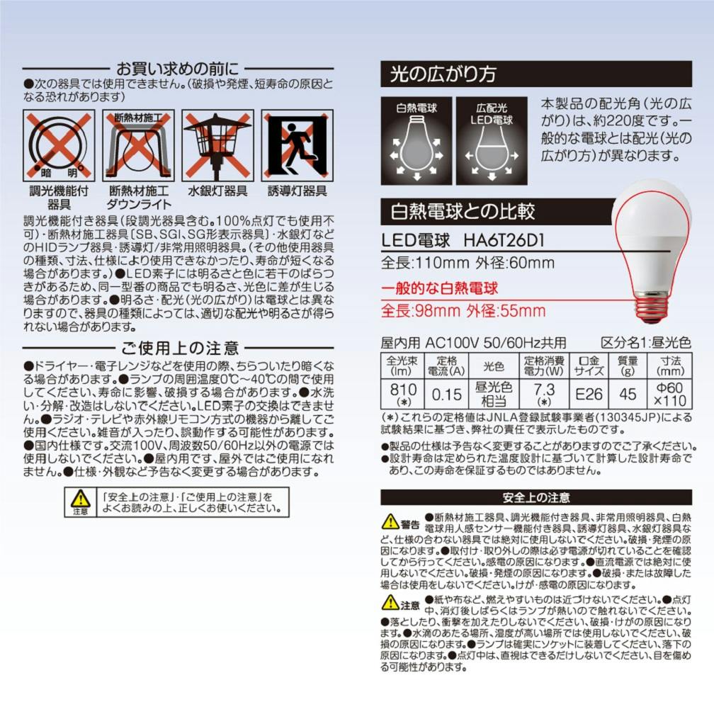 ●水滴のかかる状態や湿度の高い所、結露が起こる場所では使用しないで下さい。●電球とは光の広がり方が異なりますので、器具の種類によっては、適切な配光や明るさが得られない場合があります。●ランプの分解や改造は行わないで下さい。●部品の交換を行うことはできません。