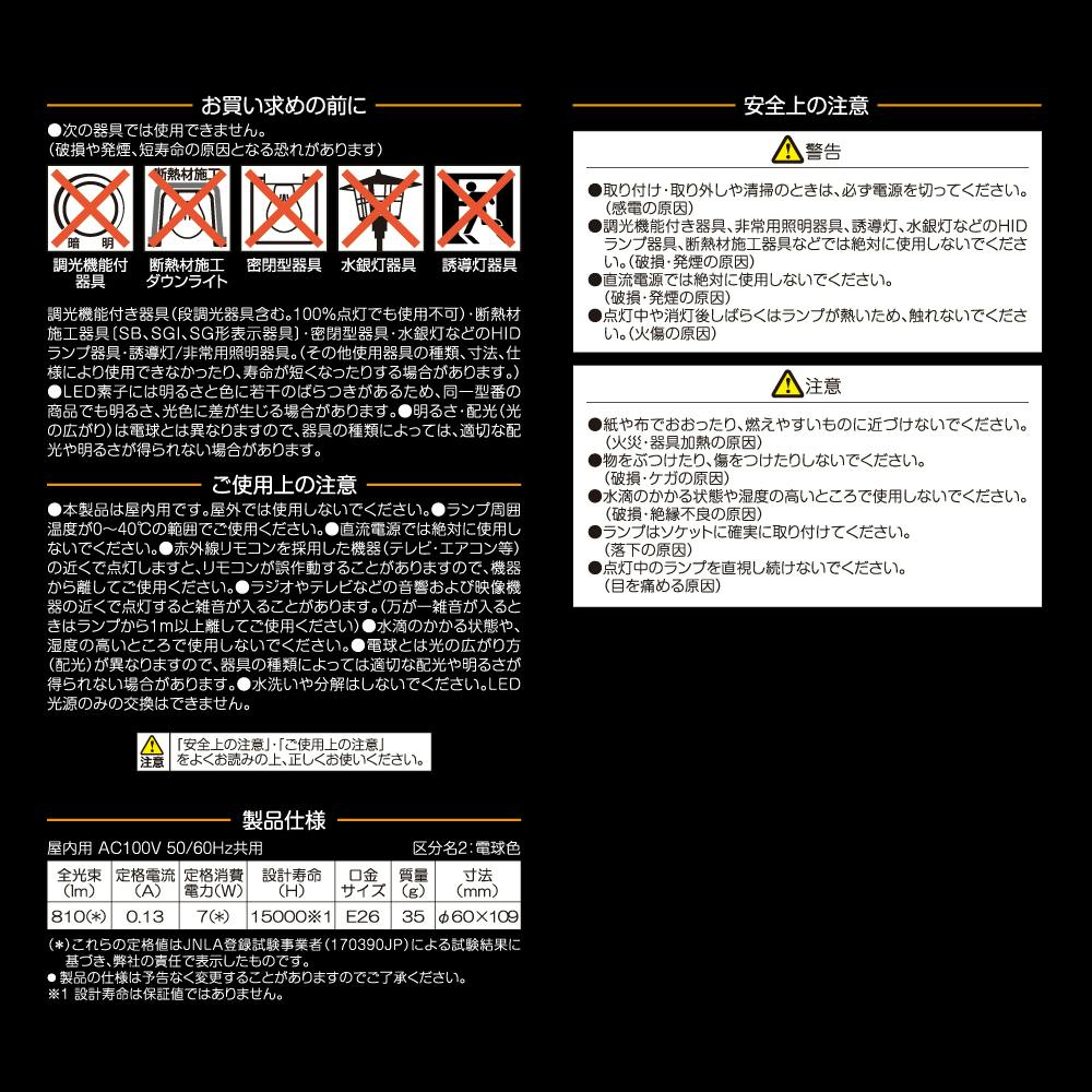 ●水滴のかかる状態や湿度の高い所、結露が起こる場所では使用しないで下さい。●電球とは光の広がり方が異なりますので、器具の種類によっては、適切な配光や明るさが得られない場合があります。●ランプの分解や改造は行わないで下さい。●部品の交換を行うことはできません。