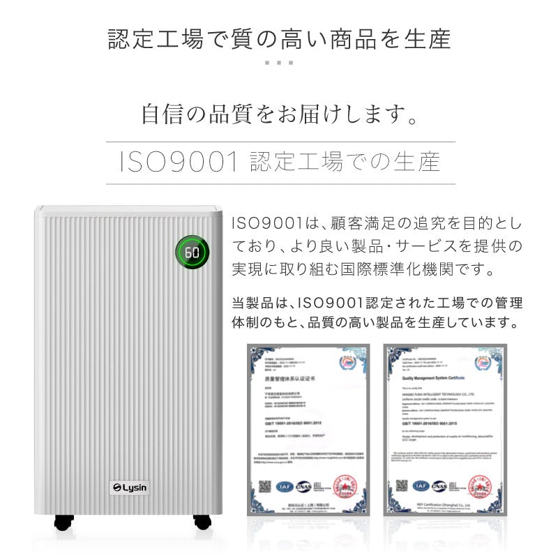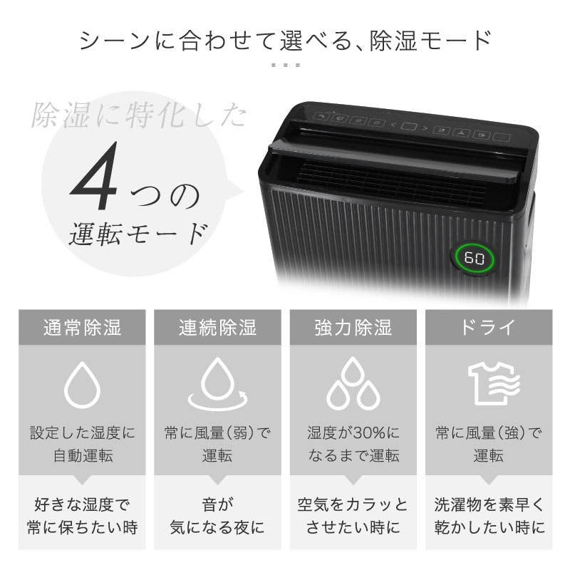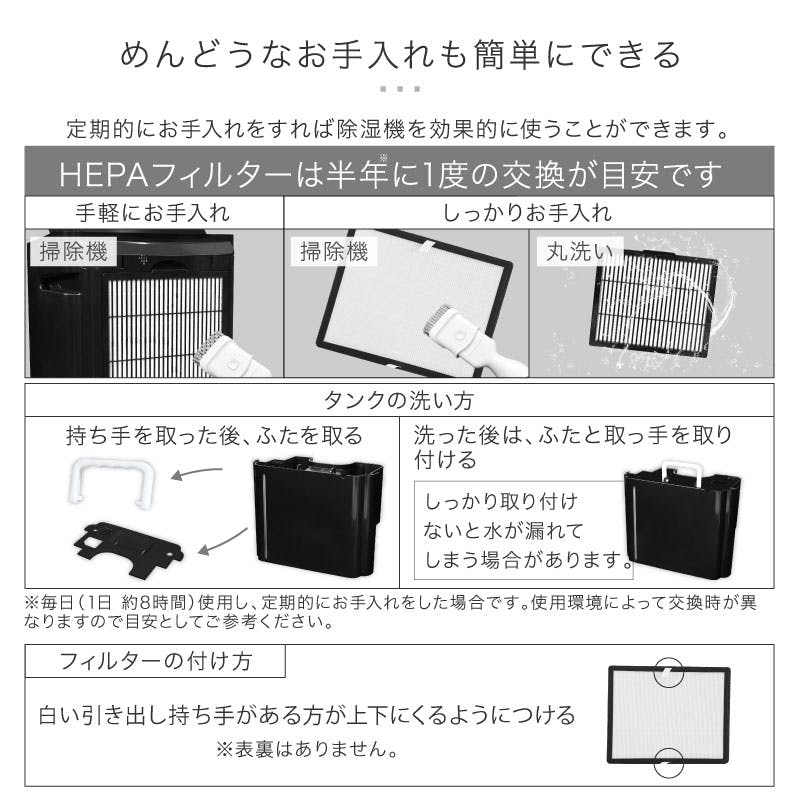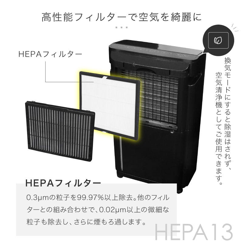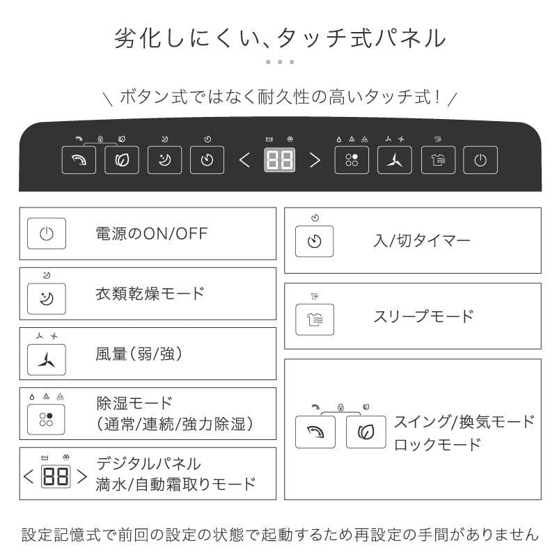 5.5Lタンク、ルーバー付き、空気清浄機能付き(HEPAフィルター)、24時間タイマー、スリープ機能、タッチパネル、11段階湿度調節、連続排水、省エネ、ドライモード、チャイルドロック、満水時お知らせ機能、湿度ライト、自動霜取り、360度回転、キャスター付き