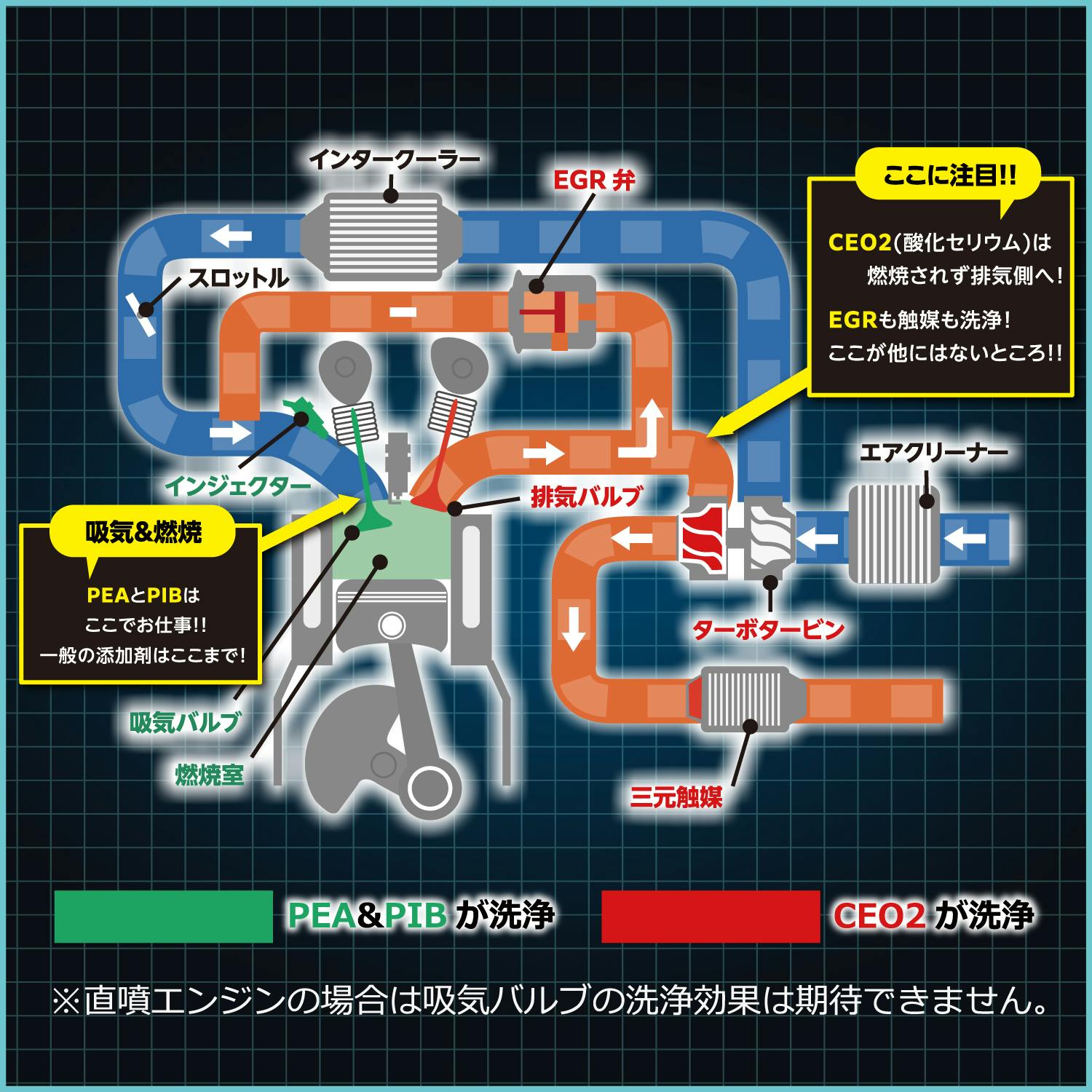 ●吸気系から排気系までエンジンの燃焼行程すべてにおいて効果が認められています!●超高濃度の洗浄成分と革新的なフリクション低減技術、防錆フィルムの相乗効果により、エンジンを最適な状態に保ち、燃費の向上と排出ガスの低減を実現。●インジェクター・インテークバルブ・燃焼室・エキゾーストバルブ・EGR・触媒まで広範囲にわたる強力な洗浄効果。●エコカーからハイパフォーマンス車、バイク等、あらゆる車種に対応。※ガソリン燃料専用です。その他の燃料車両には使用しないでください。