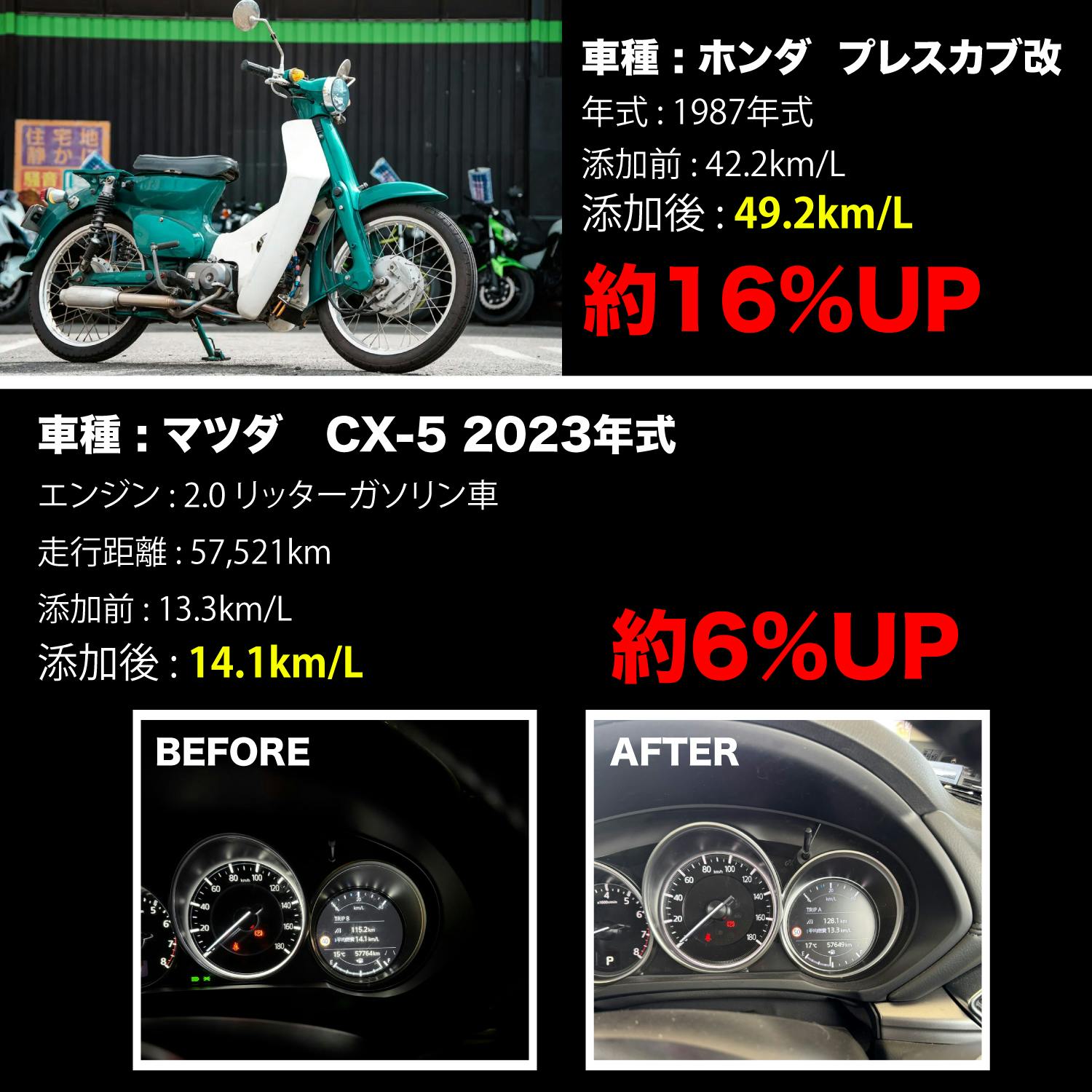 ◆燃費や出力の向上効果は使用環境、車両の状態、および運転方法により異なります。◆表示データは独自試験に基づくものです。すべての車両や条件下で同等の効果を保証するものではありません。◆本製品の使用前に、車両の取扱説明書をご確認ください。◆適切な整備状況や正規の使用方法で使用されない場合、記載の効果を発揮できない場合があります。◆本製品は危険有害物質を含みます。自動車メンテナンスに関する知識を十分に有するプロメカニックの指導に従ってご使用ください。