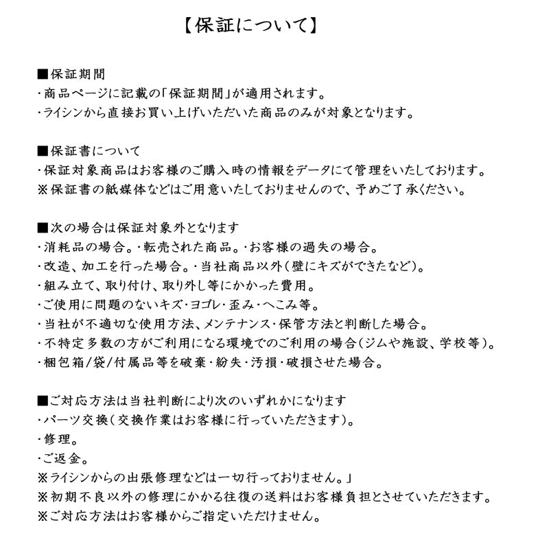 ■消耗品の場合。■転売された商品。■お客様の過失の場合。■改造、加工を行った場合。■当社商品以外(壁にキズができたなど)。■組み立て、取り付け、取り外し等にかかった費用。■ご使用に問題のないキズ・ヨゴレ・歪み・へこみ等。■当社が不適切な使用方法、メンテナンス・保管方法と判断した場合。■不特定多数の方がご利用になる環境でのご利用の場合(ジムや施設、学校等)。■梱包箱/袋/付属品等を破棄・紛失・汚損・破損させた場合。