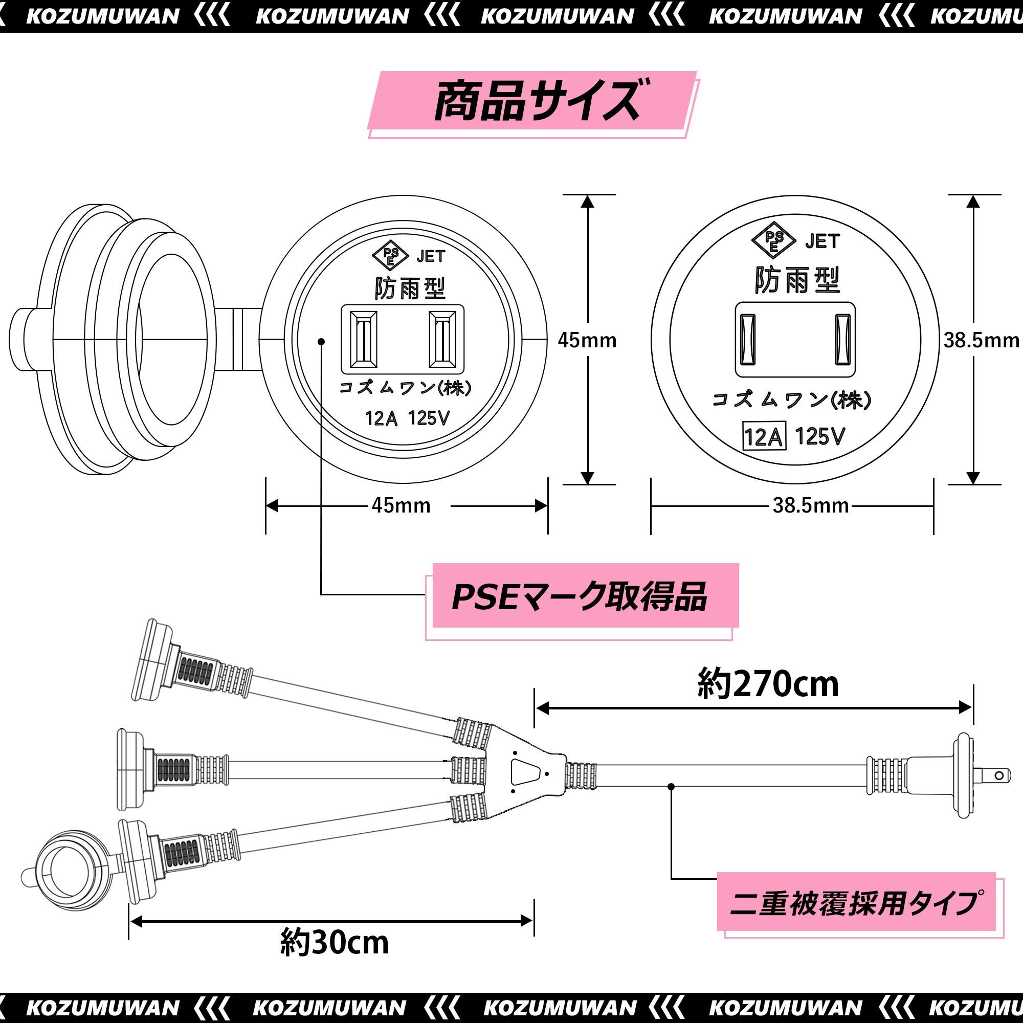 KOZUMUWAN 延長コード 3m 3分岐 防水型 防雨延長コード 分配コード 電源ケーブル 3個口 電源コード LEDイルミネーション用 屋外用 丸型プラグ 2芯 二重被覆 作業用 PSE認証 防雨キャップ付 耐寒 耐熱 耐摩耗 防塵 便利 トラッキング防止 ブラック(3m)