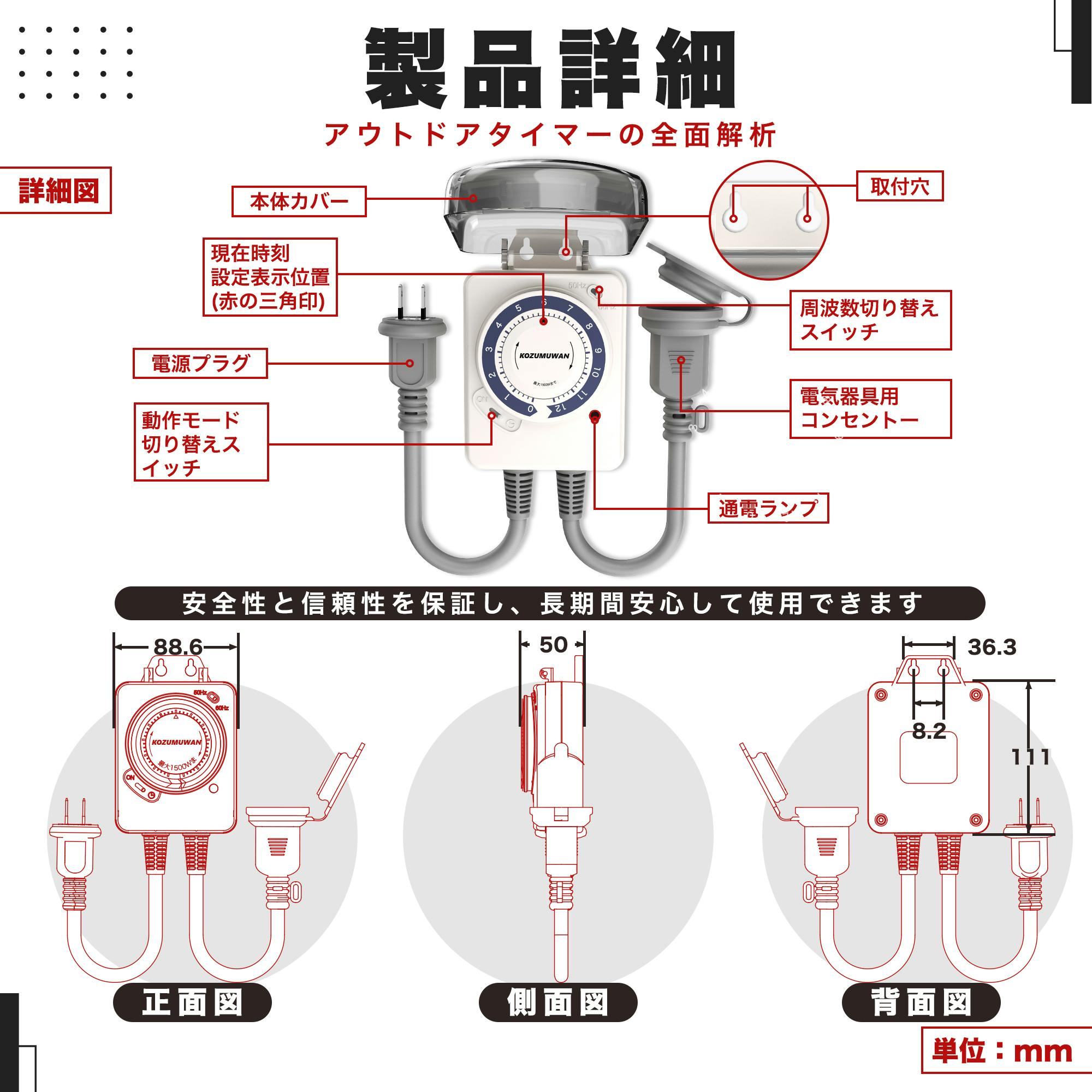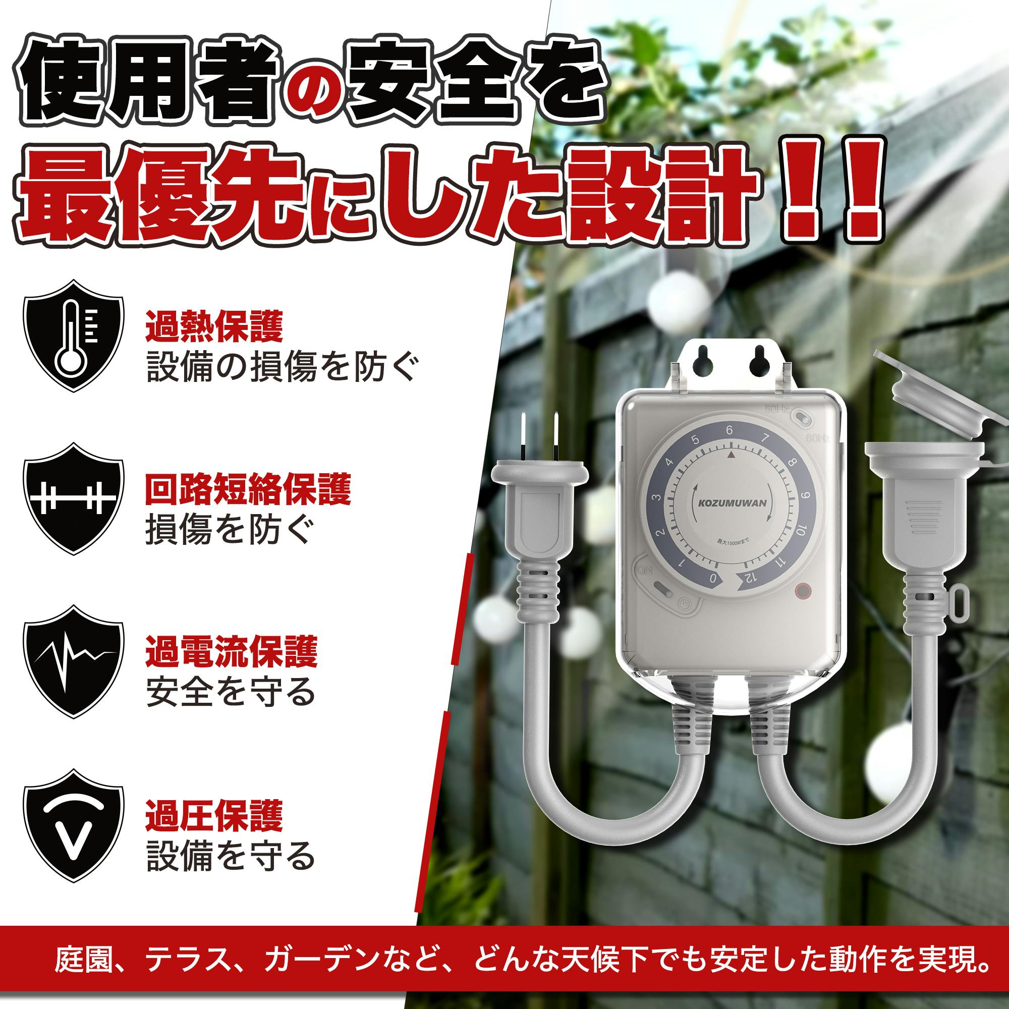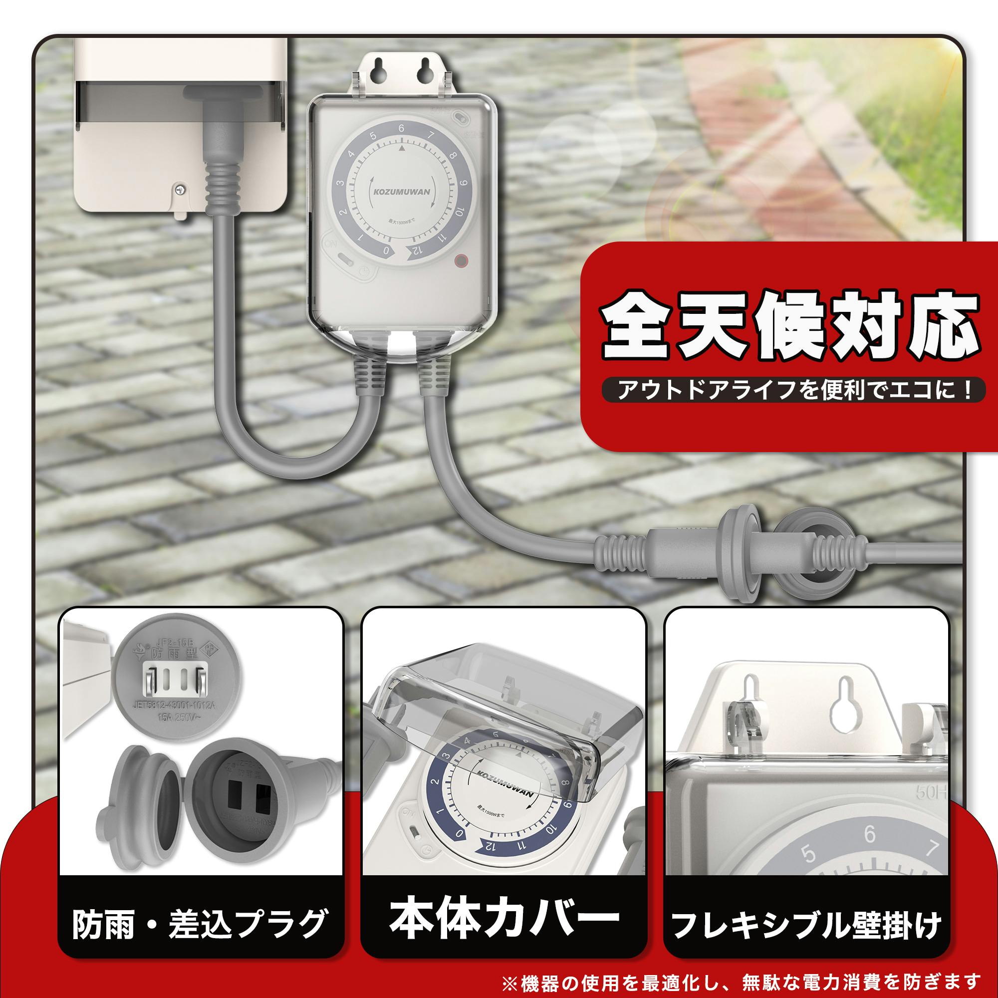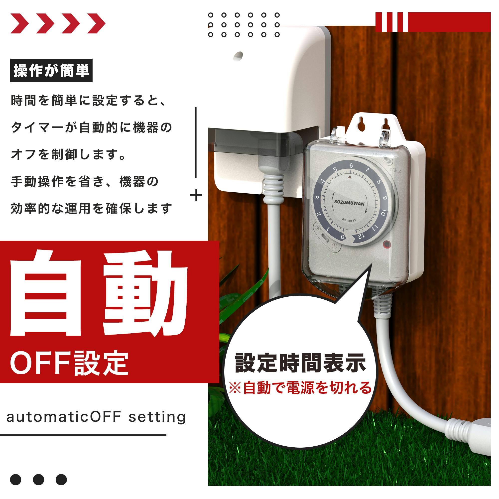 KOZUMUWAN タイマーコンセント 12時間 防雨型 屋外用 ダイヤル カウントダウン式 防雨カバー キャップ付 壁掛け穴 タイマー コンセント直結式 節電対策 自動 簡単操作 消し忘れ防止 消灯時間設定 電源オンオフ 装飾灯 玄関灯 防犯灯 照明器具 クリスマス
