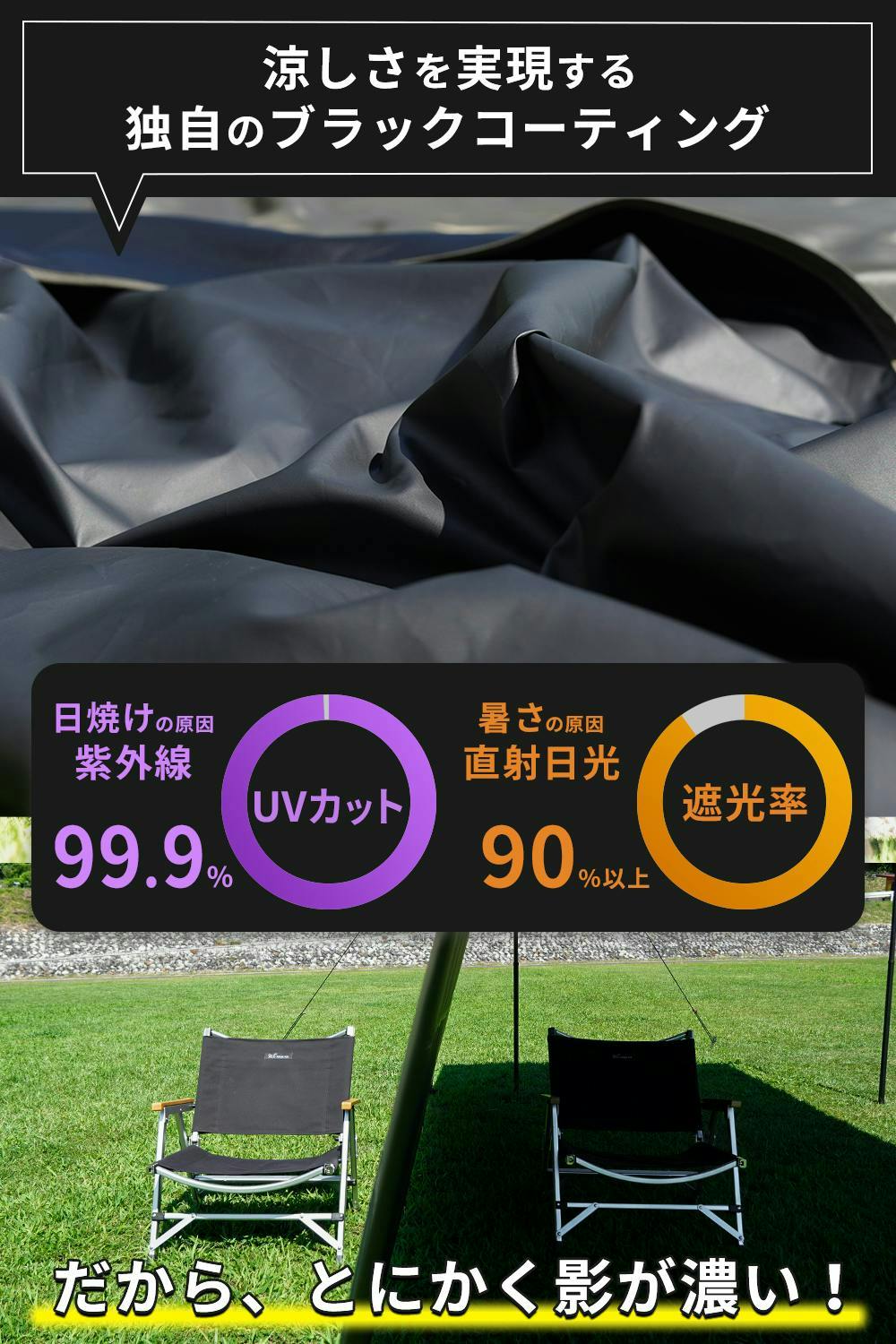 【スクエアタープ】圧倒的な涼しさを求める方にぴったりな、ポリエステル製のスクエアタープです。タープ裏面に独自のブラックコーティングを施しており、遮光率90%以上、UVカット率99.9%を実現しました。ポリエステルなのに、コットンやポリコットンのタープにも劣らない涼しさを提供します。