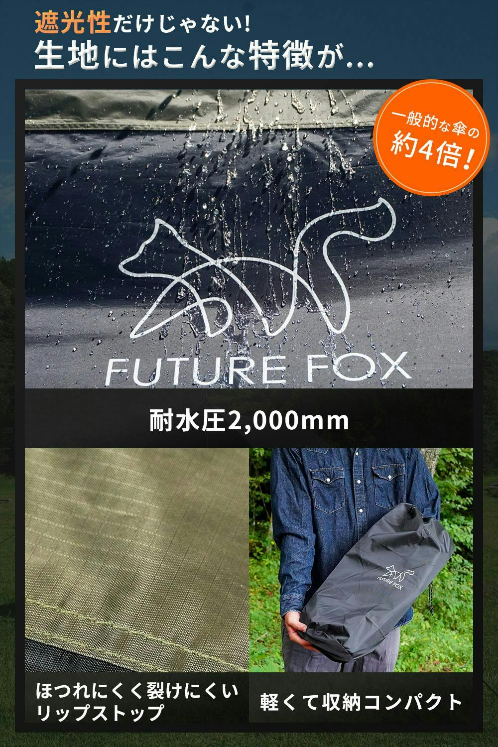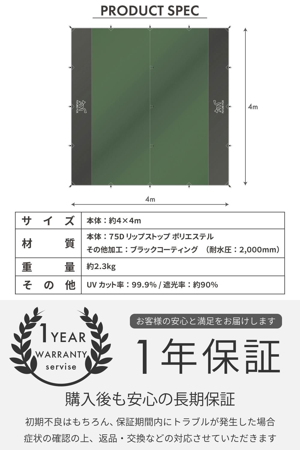 【サイズ】4×4m【重量】約2.3㎏【材質】75Dリップストップポリエステル(ブラックコーティング)【耐水圧】2,000mm【UVカット率】99.9%【遮光率】約90%