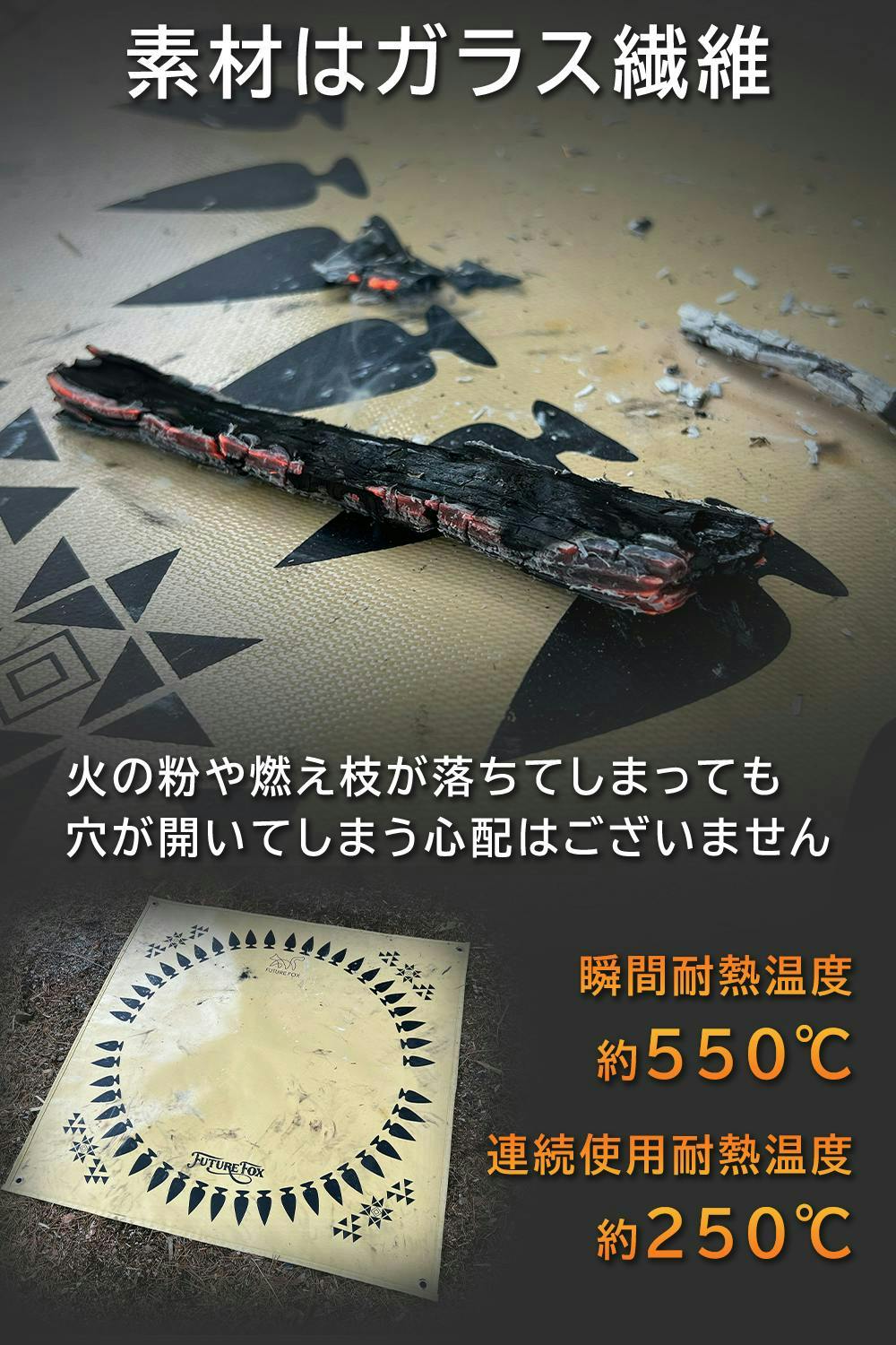 【素材はガラス繊維】焚き火シートの素材はガラス繊維を使用しています。この素材は瞬間耐熱温度が約550℃、連続使用耐熱温度が約250℃となります。そのため火の粉や燃え技が落ちてしまった場合でも穴が空いてしまう心配はございません。焦げはつきますが、素材をクリーム色にしていることで目立ちにくくなっています。ナバホ柄をふんだんに使用しているので使っていくうちに焦げが増えていき、より味が出る焚火シートとなります。