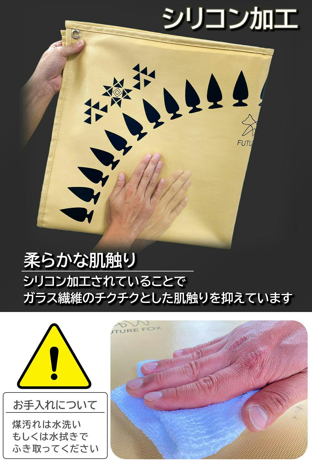 【表面はシリコン加工】焚き火台シートの表面はシリコン加工を施しています。そのため、 水洗いや濡れている布で汚れを落としていただくことが可能です。また、ガラス繊維特有のチクチク感も軽減してくれます。