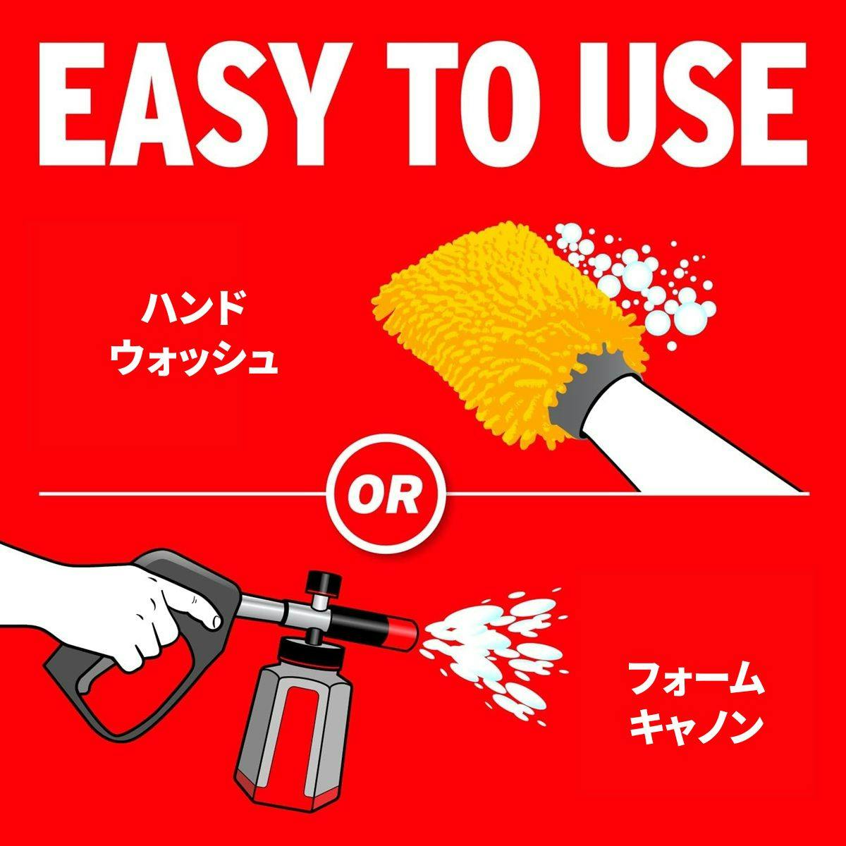 ●洗車しながら撥水&保護●驚くほど滑らかな洗浄体験●シミ・スジなしのクリアな仕上がり●pH中性処方で環境に優しく安心して使用可能●フォームキャノン対応で簡単施工●爽やかなスイカの香りで快適な洗車時間