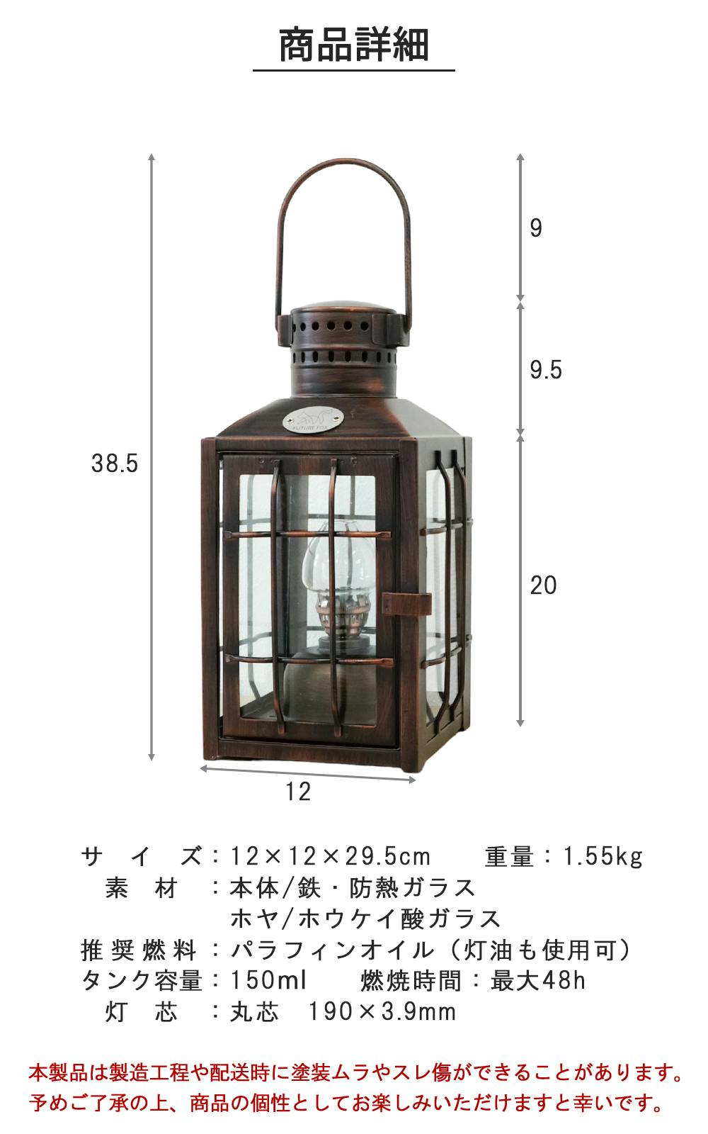 【サイズ/スペック】12×12×29.5cm/重量1.55Kg/本体:鉄・防熱ガラス/ホヤ:ホウケイ酸ガラス/タンク容量150ml/燃焼時間最大48時間/灯芯(丸芯):190×3.9mm/※本製品は製造工程や配送時に塗装ムラやスレ傷ができることがございます。予めご了承の上、製品の個性としてお楽しみいただけますと幸いです。