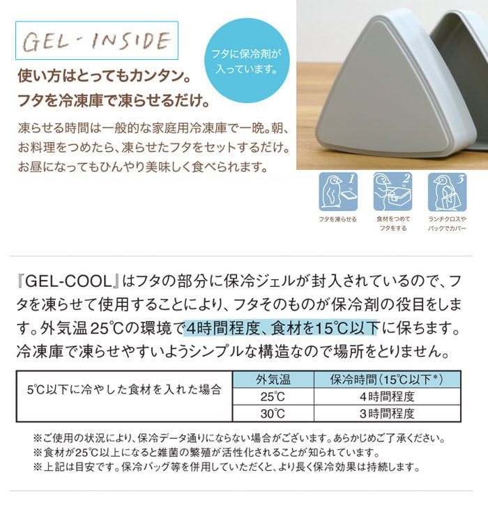 GEL-COOLに保冷蓋のおにぎりケースが登場。 大きさはちょうどコンビニのおにぎりが1個入るサイズ。 ワンタッチで開閉ができ、蓋には保冷機能がついています。