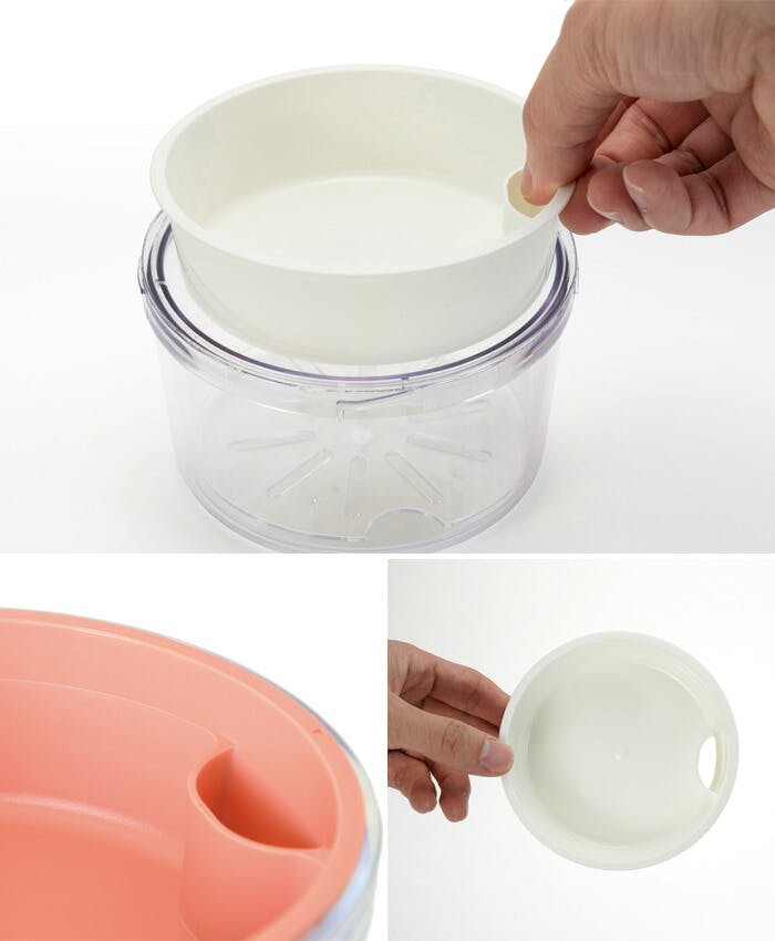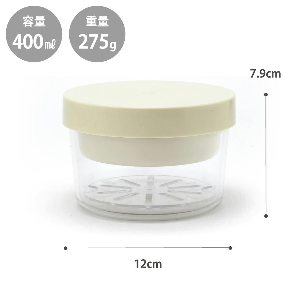 本体・水切りすのこ:飽和ポリエステル樹脂(耐熱60℃、耐冷-20℃) 中皿:ポリプロピレン(耐熱140℃、耐冷-20℃) 保冷ブタ:ABS樹脂(耐熱60℃、耐冷-20℃) パッキン:シリコーンゴム