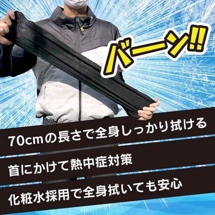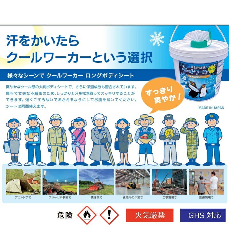クールワーカーロングボディシートにBLACKバージョンが登場!コーディネートにもぴったり。首にかけて熱中対策にも!夏の酷暑を乗り切る逸品です!爽やかなクール感の大判ボディシートで、さらに保湿成分も配合。厚手で丈夫は不織布のため、しっかりと汗を拭き取ってスッキリすることができます。ロングタイプなので首にかけたり1枚で全身を拭くことも可能です。バケツサイズで90枚と大容量となっております。