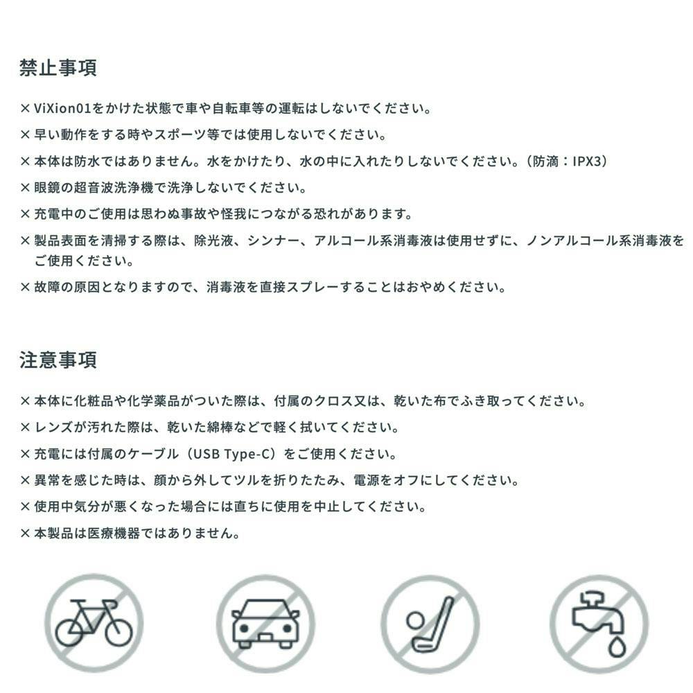 ViXion01をかけた状態で車や自転車等の運転はしないでください。早い動作をする時やスポーツ等では使用しないでください。本体は防水ではありません。水をかけたり、水の中に入れたりしないでください。(防滴:IPX3)眼鏡の超音波洗浄機で洗浄しないでください。充電中のご使用は思わぬ事故や怪我につながる恐れがあります。製品表面を清掃する際は、除光液、シンナー、アルコール系消毒液は使用せずに、ノンアルコール系消毒液をご使用ください。故障の原因となりますので、消毒液を直接スプレーすることはおやめください。