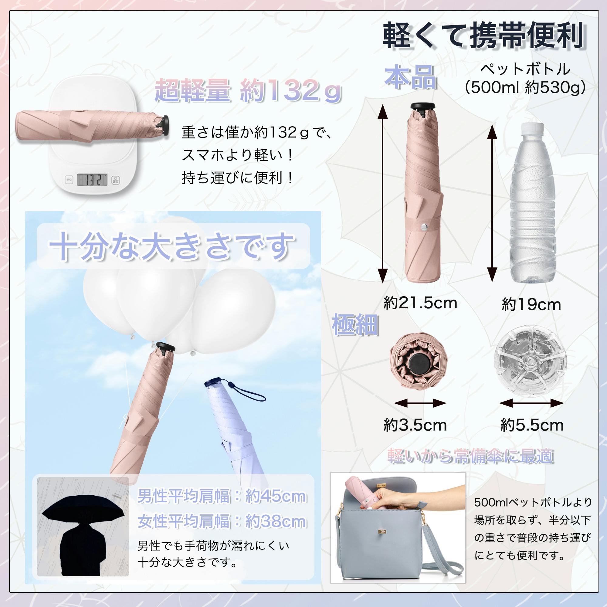 表面:ポリエステル100% ハンドル:高品質ABS樹脂 親骨:アルミ、カーボン 中棒:アルミ