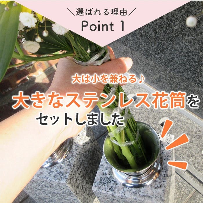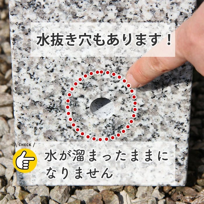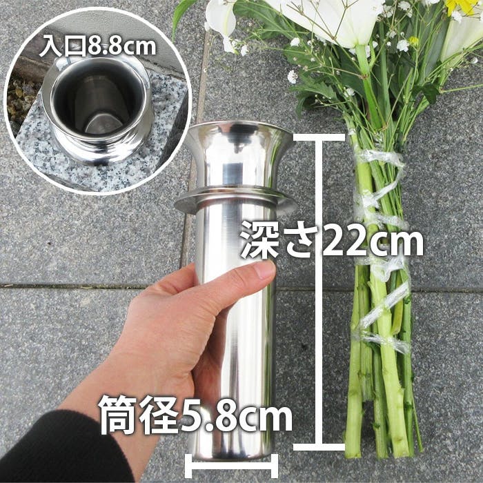 ●花立を交換するだけでお墓はびっくりするくらい立派に変身します。●水抜き穴あり●大きなお花もお供えできます。●御影石は本磨きのため表面はツルツルとしています。●御影石からステンレス花筒は取り外せますので、お水の交換は容易です。●花立てがなく、お花をお供えできなかったお墓に最適。